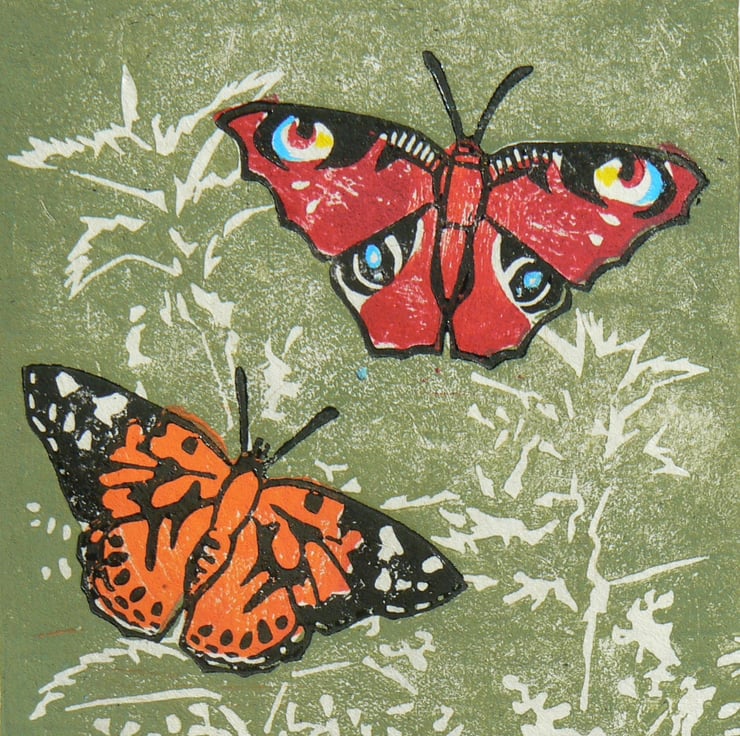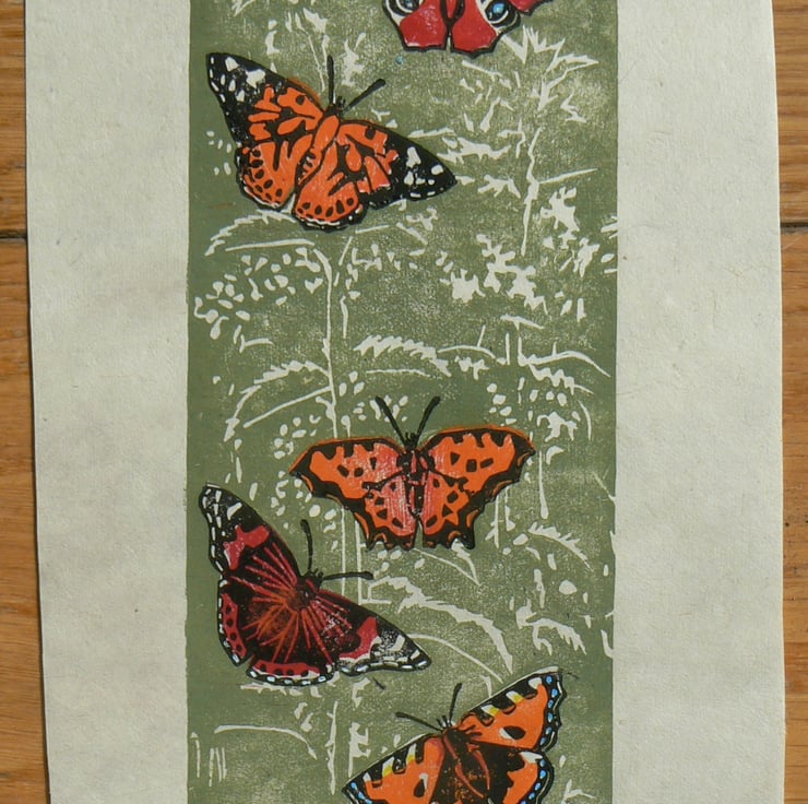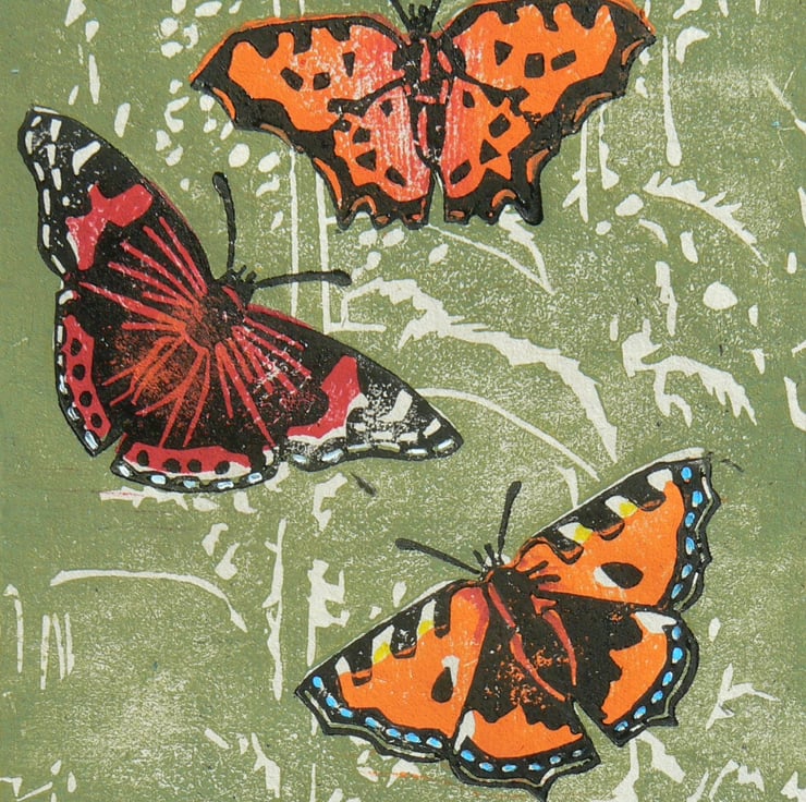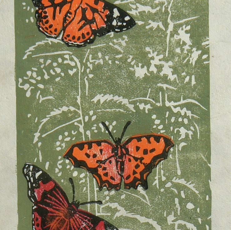 Five of our beautiful butterflies often spotted in the garden, all oranges and reds against a background of their favourite food, nettles, always worth leaving a small patch in your garden if you have the space. The butterflies from the top are: Peacock; Painted Lady; Comma; Red Admiral; Small Tortoiseshell.