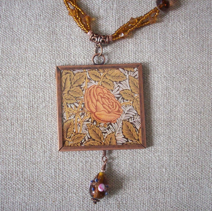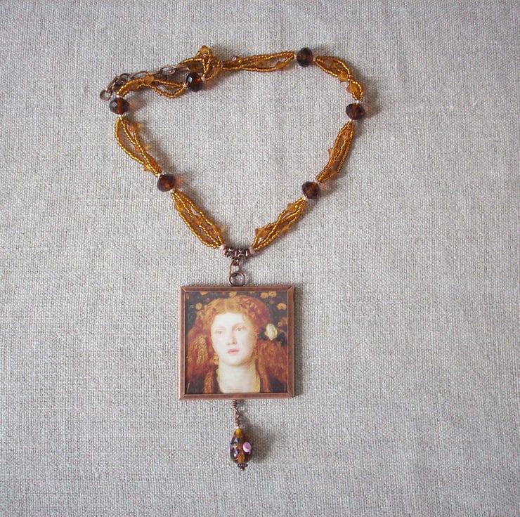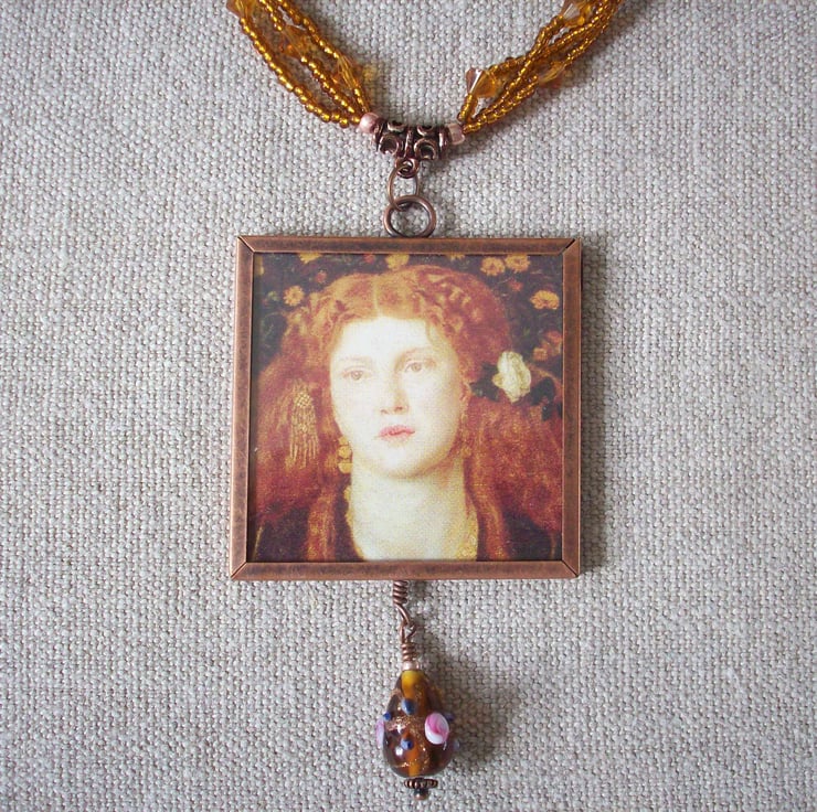 Found image of this famous work by Rossetti, framed under glass and strung on a beaded triple strand. The tawny colours of the oil painting are echoed in the beads chosen. There is a richly coloured and foiled handmade Venetian bead drop with tiny roses, and amber faceted vintage beads are on the triple bead cord, punctuated by beer-bottle brown faceted beads. The reverse image is of a William Morris design. Comes to you in an organza bag. I always use Special Delivery for the insurance cover for both buyer and seller. For non UK and multiple orders please contact me as prices vary. Thanks for looking and for supporting handmade!