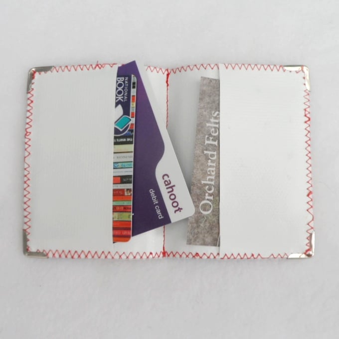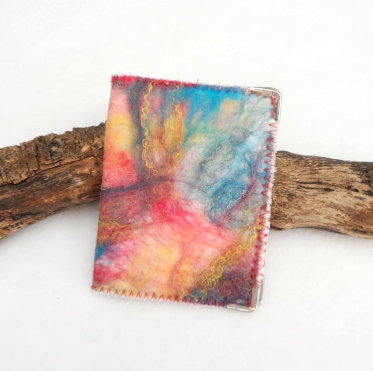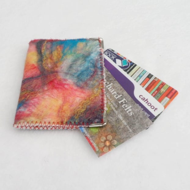 This card wallet has been made using a piece of handmade felt made using many different colours of merino wool wet felted into a felt sheet. It has been lined with a white vinyl material and silver coloured corner protectors have been added. Inside are two pockets, each large enough for several cards. Ideal for holding all your credit, debit and business cards and even a folded £10 note.