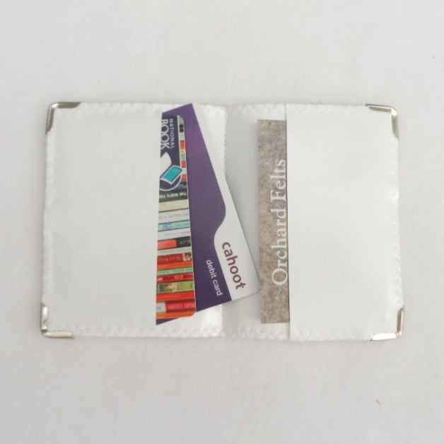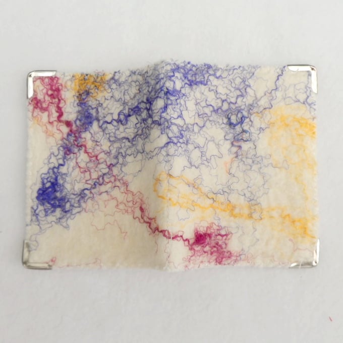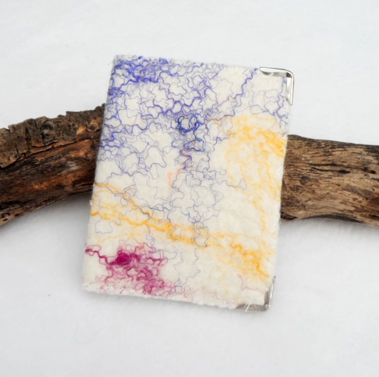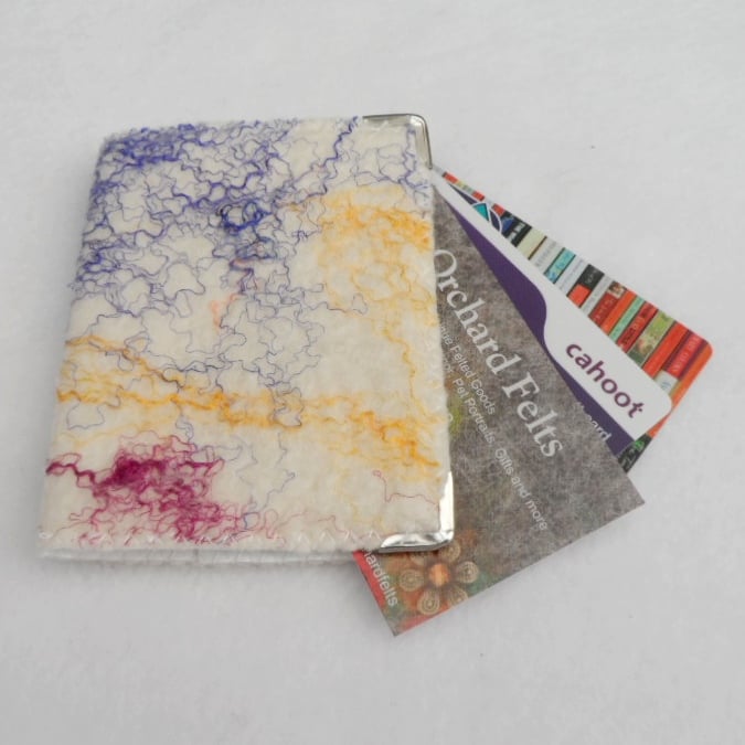 This card wallet has been made using a piece of handmade white felt that has been embellished with silk fibres in various colours. Inside it has been lined with white vinyl and has two pockets each of which is large enough to hold several cards. Ideal for keeping all you credit/ debit cards, membership cards, ID etc with you. Silver coloured corner protectors have been added.