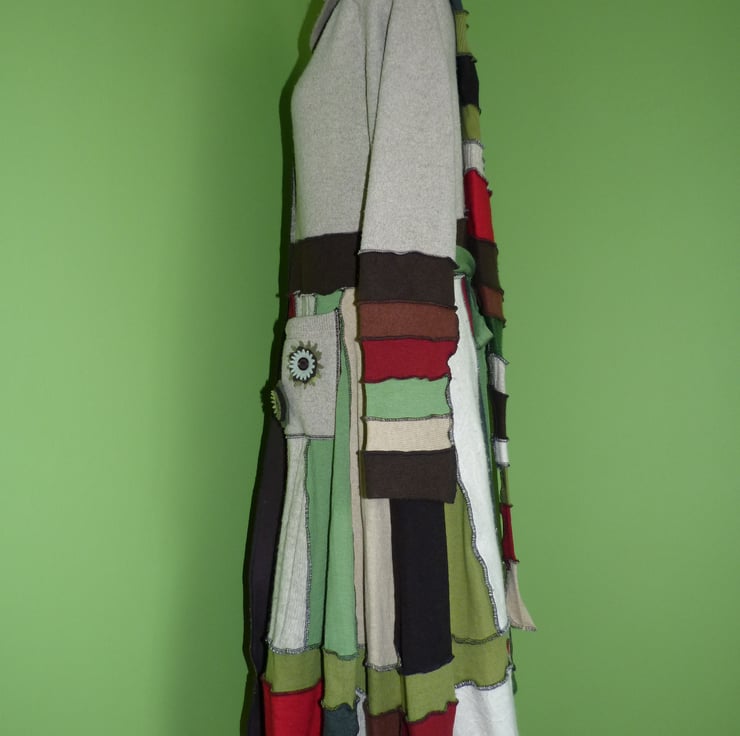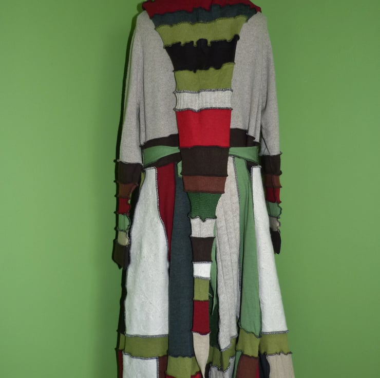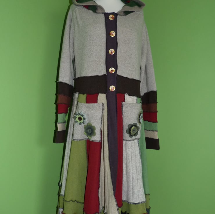 This fantastic up-cycled coat is created from wool, cashmere and mohair jumpers. These are previously loved and recycled jumpers, that I have washed in a hot temperature and pre-shrunk. I have then cut and re-stitched the jumpers, with all seams being professionally finished with a serger/overlocker, to create this fabulous coat.