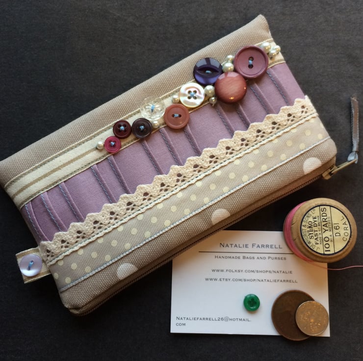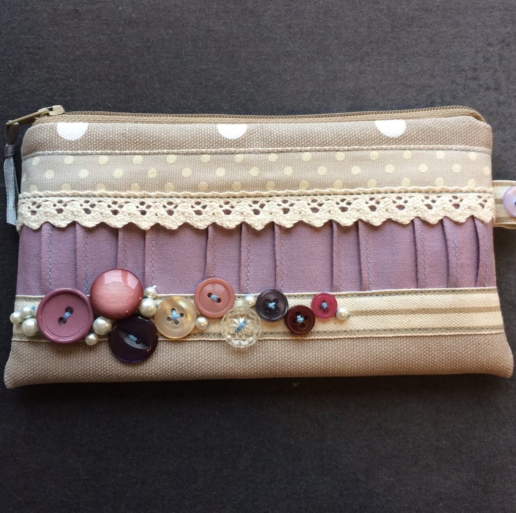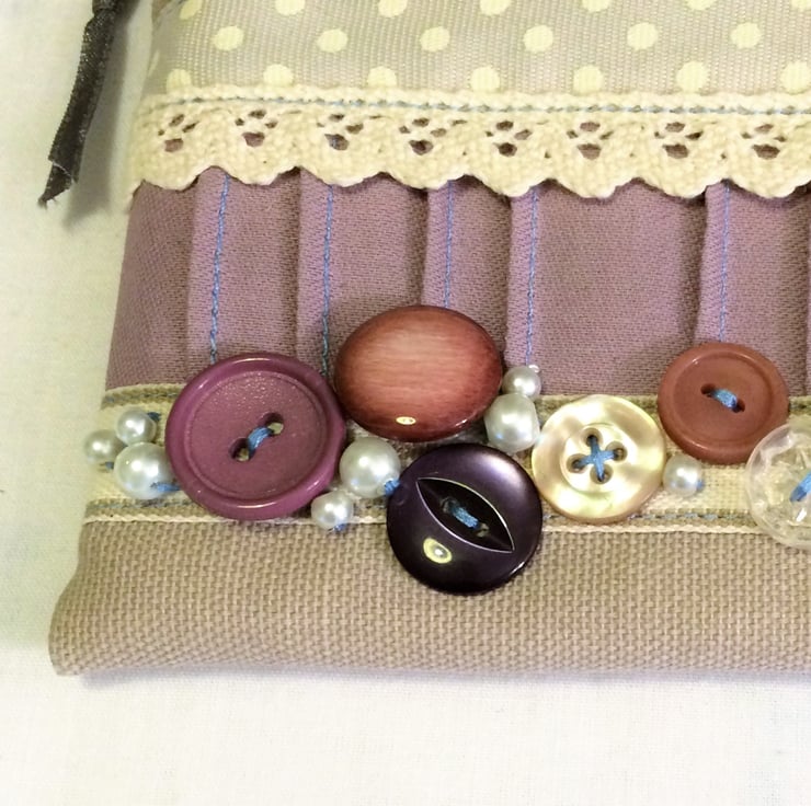 Handmade dotty make-up purse, embellished with vintage buttons, spotty and striped ribbon and hand crafted fabric trim.
