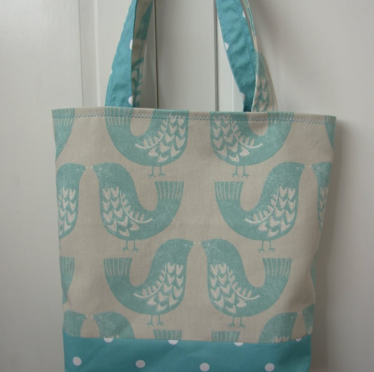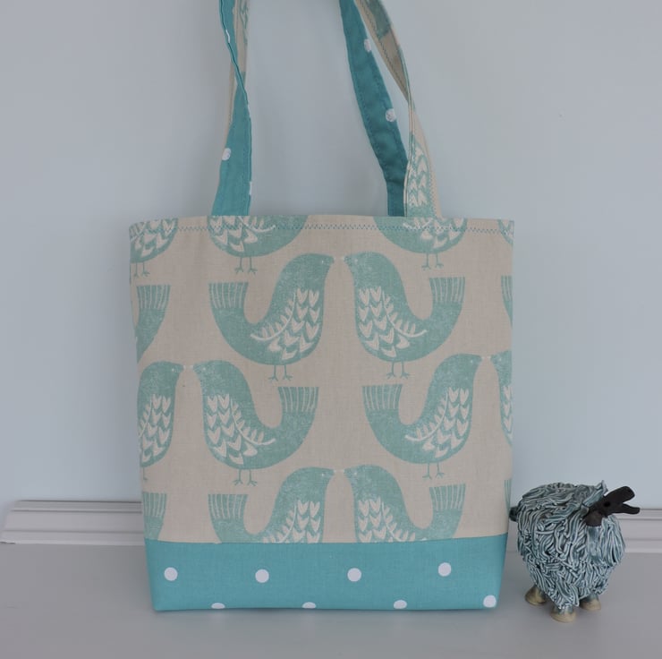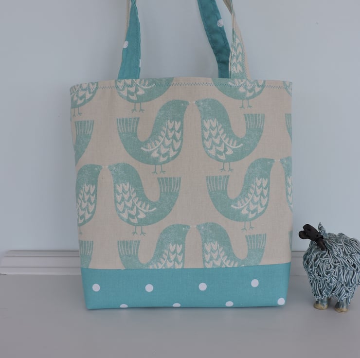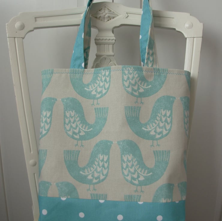 I've made this handy tote bag, shopping bag, craft bag from an cream and pale turquoise Scandi Birds linen fabric. It has a turquoise and white spotted squared off bottom to the bag and is fully lined in a mid blue cotton fabric.