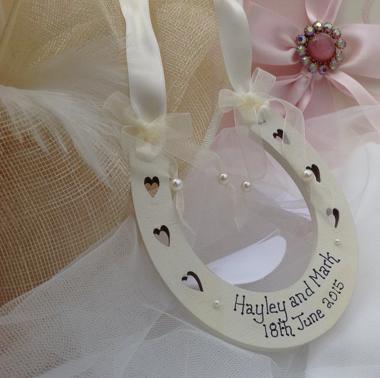 Handcrafted and personalised horseshoe made from wood and carefully painted, finished and decorated with the Bride and Grooms names and Wedding date to the front and supplied in a co-ordinating organza gift bag.