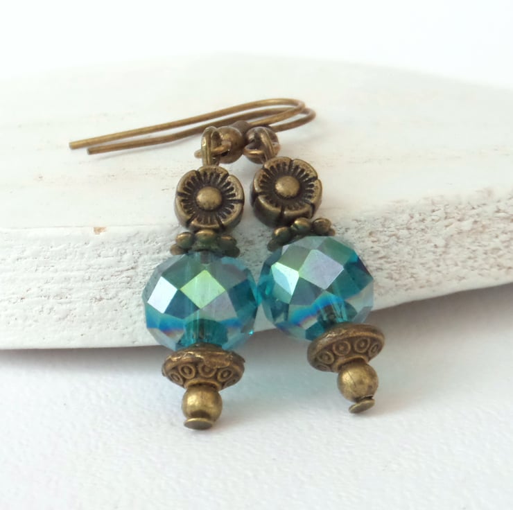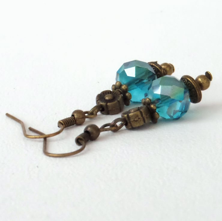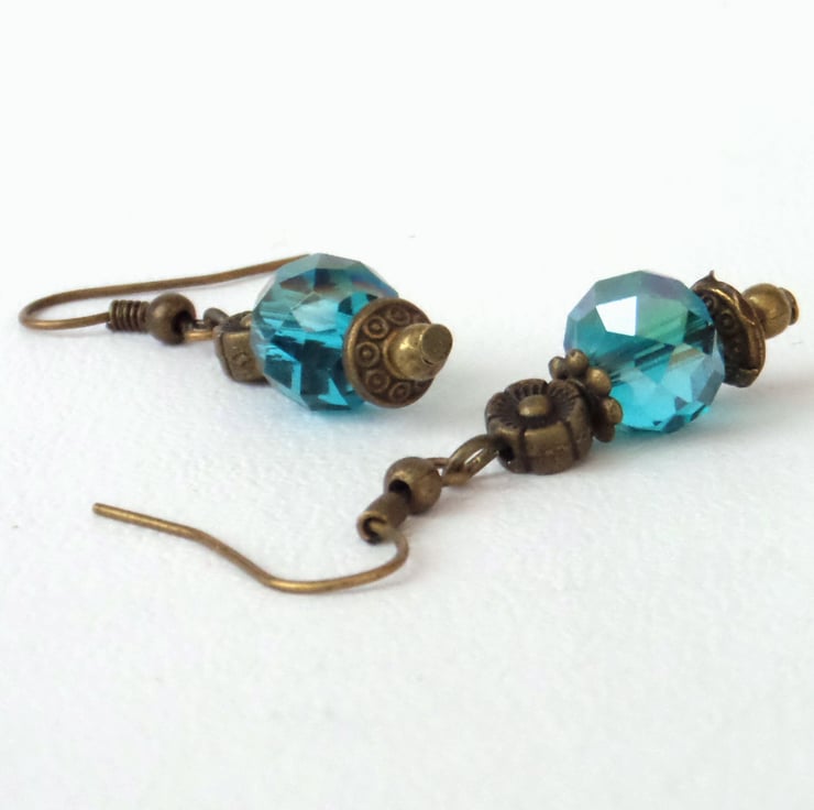 Teal coloured crystal rondelles hang from bronze wires in these vintage themed earrings.