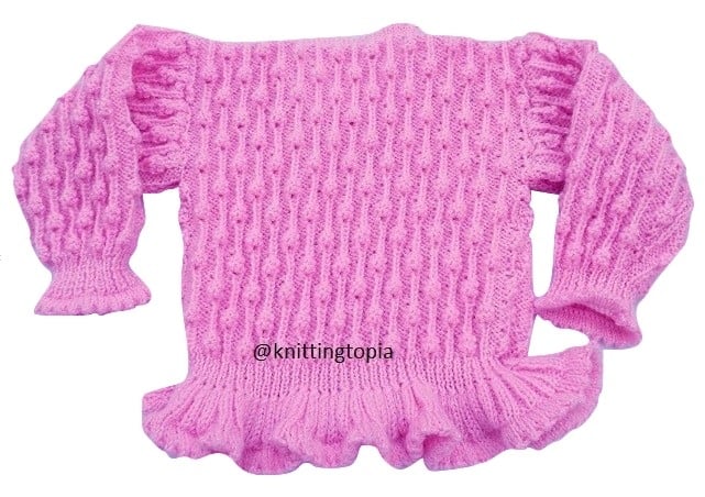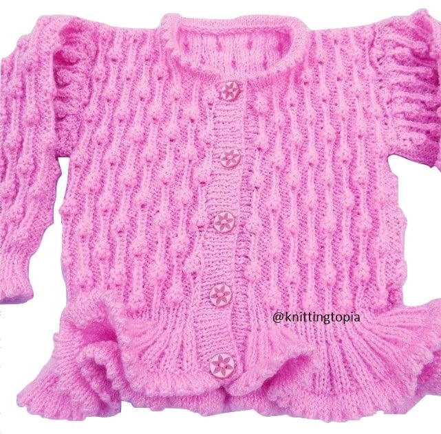 This girls cardigan has been hand knitted using baby twinkle yarn in pink which has a lovely sparkle to it. The cardigan has an all over textured bobble pattern and a gorgeous frill to the hemline. It fastens down the front with pink buttons.