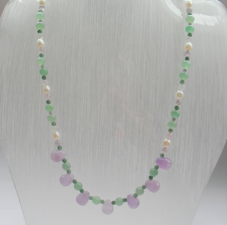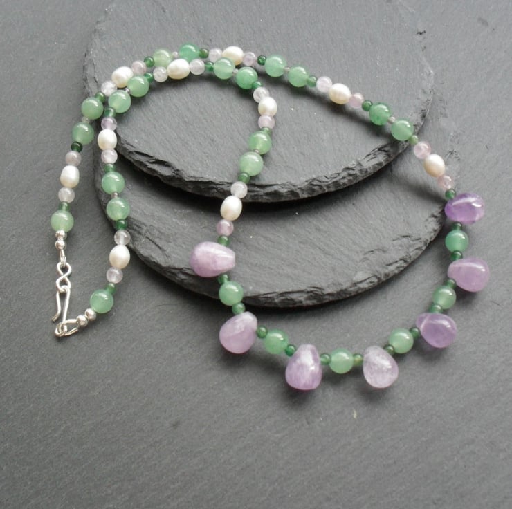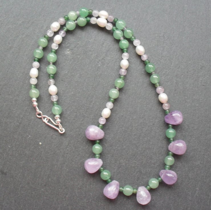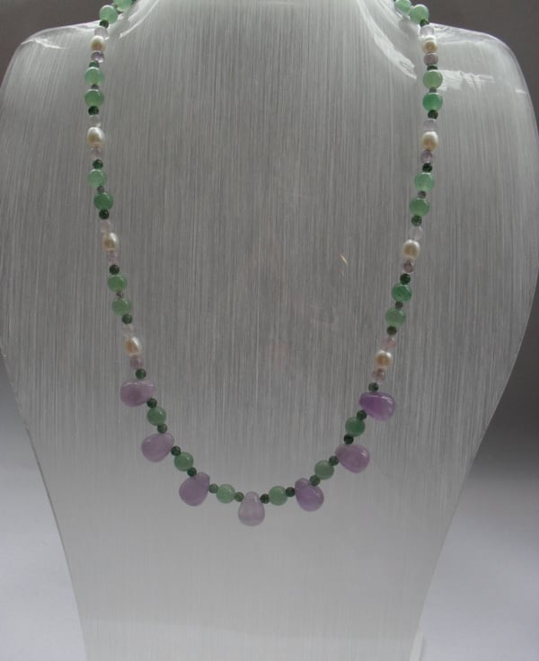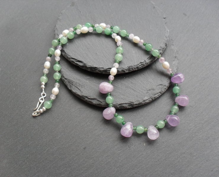 Lilac Amethyst drops, green aventurine and small freshwater cultured pearls are beaded with a good quality beading wire and attached to a sterling silver hook and eye clasp.