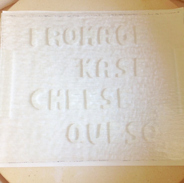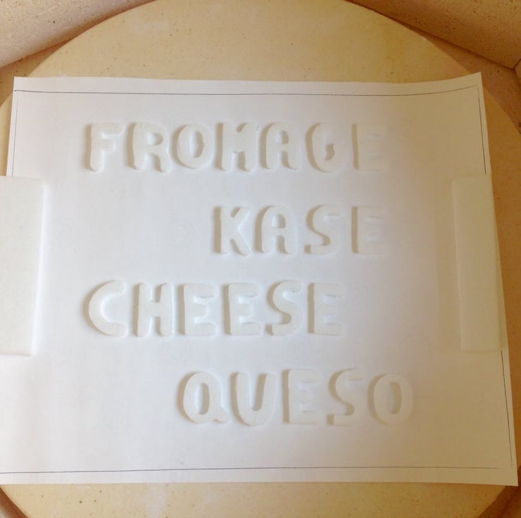 Measuring approx 254 mm x 200mm (10" x 8") this clear glass cheese board has been made using two sheets of clear glass. By using the kiln-carving method, letters have been cut out from fibre board and placed under the glass. Once placed in the kiln and heated to 800 degrees Celsius the glass forms around the letters, burning away the fibre, and leaving an imprint behind. The letters form the words for "cheese" in 4 different languages whilst each side has a raised ridge to help lifting and the board.