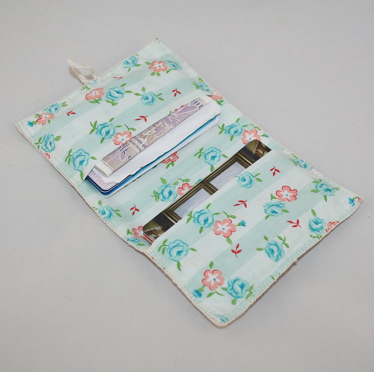 The case has been lined with a turquoise and white striped and floral fabric, which has also been used to provide the two internal pockets to hold your cards. Entirely hand-stitched, and stiffened by two layers of interfacing, the wallet has been finished by edging in blanket stitch. It closes by a hand-stitched loop over a vintage button.