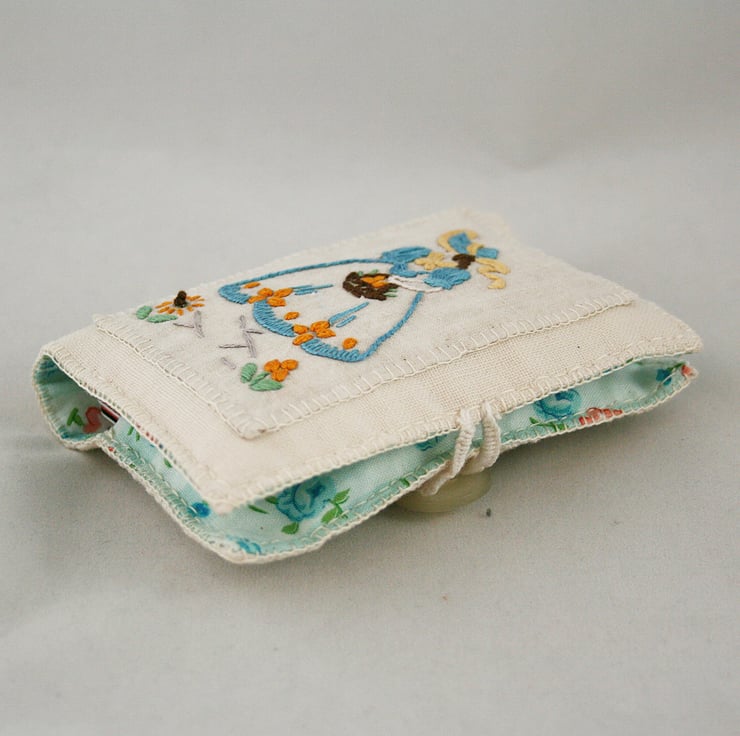 I have been using a card case cut from this pattern for several years. In an attempt to rescue as much vintage stitchery as possible, this one has been decorated with a panel from a vintage traycloth.