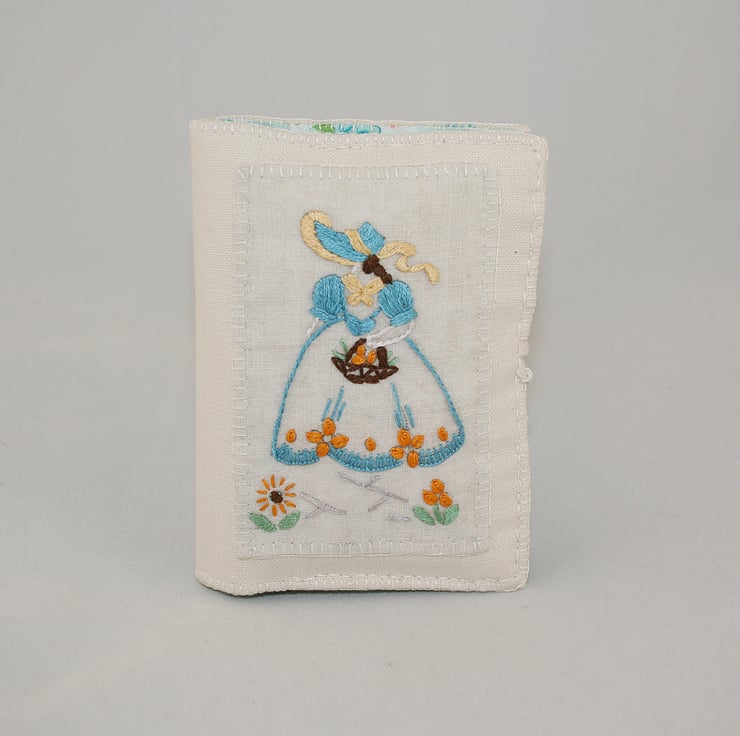An embroidered panel featuring a 'crinoline lady' has been taken from a vintage tray cloth and hand appliqued to a matching ecru background to form the cover of this practical and pretty card wallet.