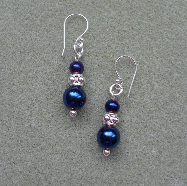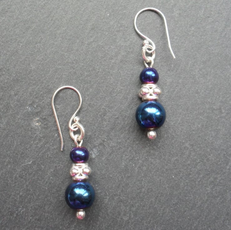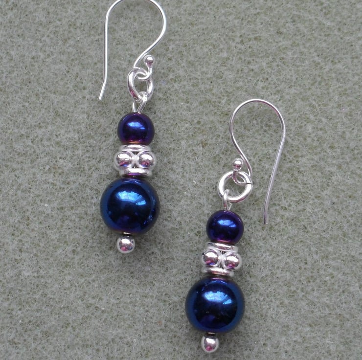Blue coated haematite and silver plated beads are attached to silver plated ear wires