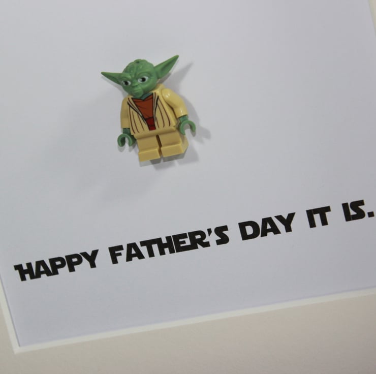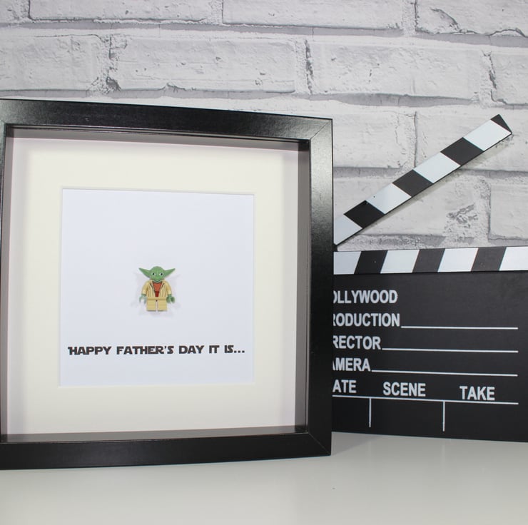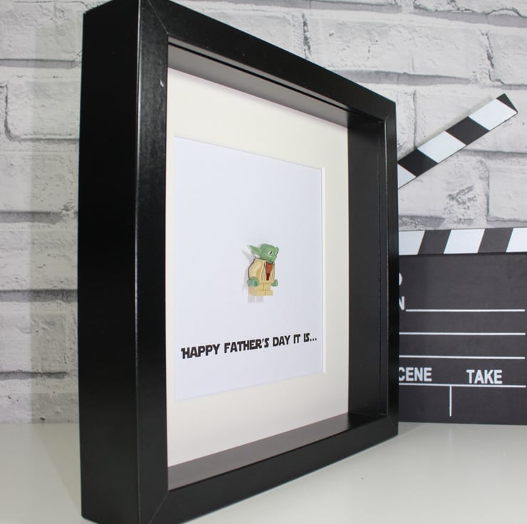 This deep box frame features an original Lego minifigure of Yoda mounted along with the words "Happy Father's Day it is..."