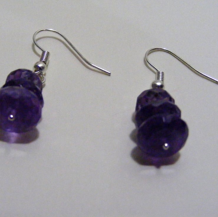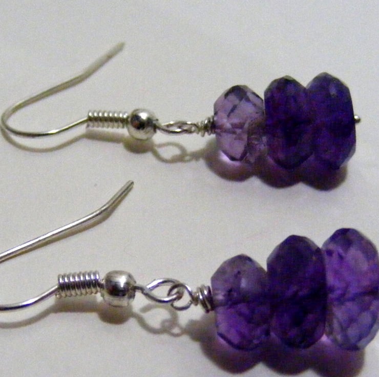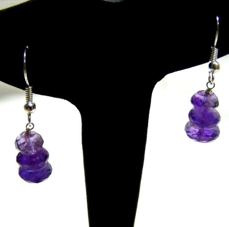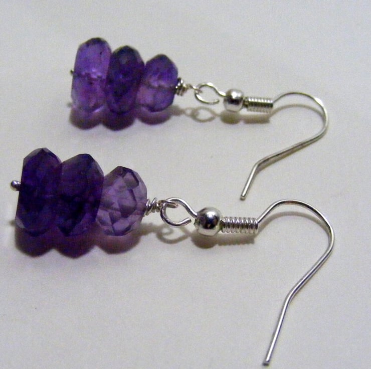 9 mm 7 mm and 6 mm faceted amethyst rondelles onto silver plated ball headpins. Attached silver plated ear wires complete the earrings.