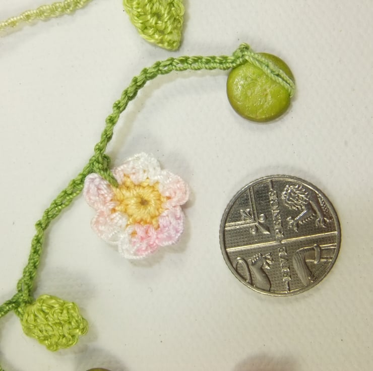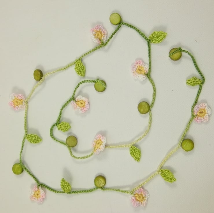 A cross between a greeting and a keepsake gift, this versatile string of tiny crochet flowers and leaves could be used as a headdress, necklace or pretty garland; ideal for the festival season! It is made from 100% cotton yarn and wooden beads. Each flower measures approximately 1.5 cm in diameter and the whole chain is approximately 70 cm long. It comes wrapped in tissue paper with a presentation envelope designed to look like a vintage seed packet. There is space on the back for you to write a message to the recipient.