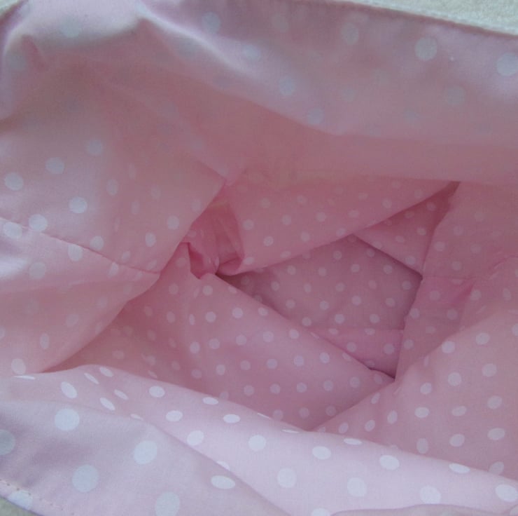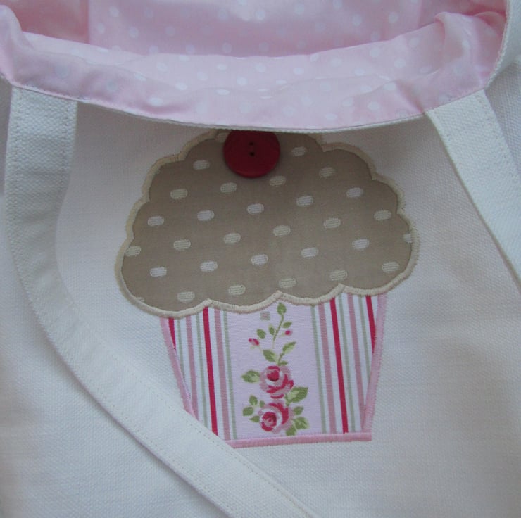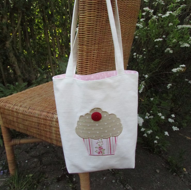 An ivory cream tote bag with a cute appliqued cupcake. The cupcake is a lovely gold satin-finish fabric with a textured cream spot pattern. The cake case is a floral and stripe print fabric in pretty pastel shades of pink, green, red and white. The cake is embellished with a lovely red button cherry. The bag is fully lined with pale pink fabric with white polka dots which co-ordinates beautifully with the cupcake colours.