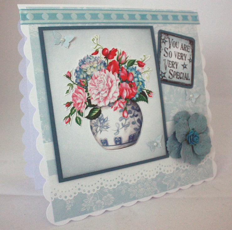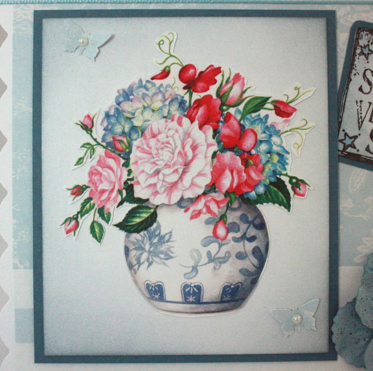 Square, scalloped greetings card featuring a pretty vase of flowers. The card would be suitable for birthdays, thank you, thinking of you or as a retirement or leaving card. The image has been cut out and layered over white, distressed card and co-ordinating blue card. This has then been overlaid onto delicate blue and white background paper, together with ribbon, floral embellishments and die cut butterflies.