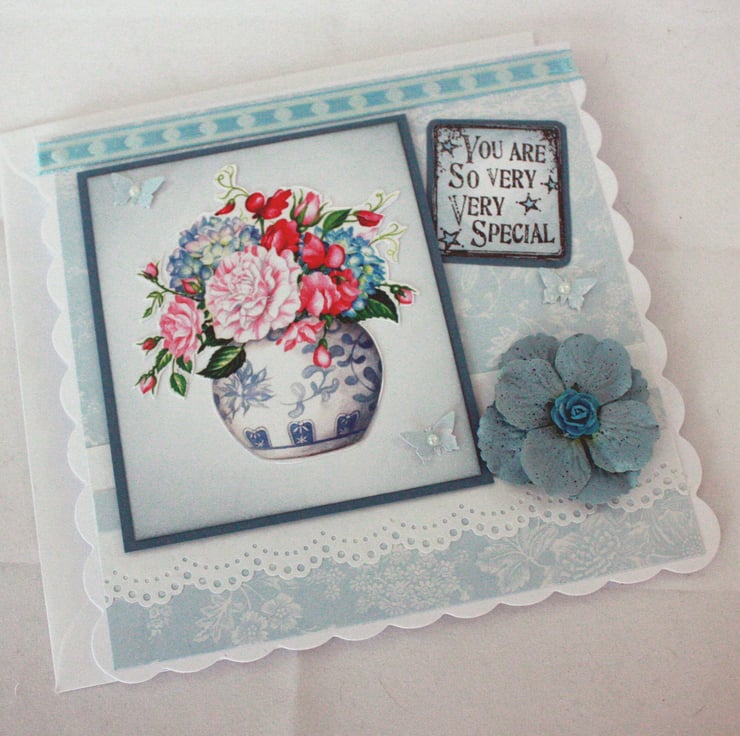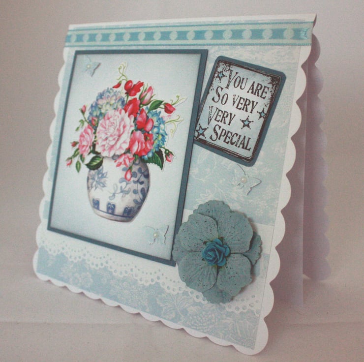 Square, scalloped greetings card featuring a pretty vase of flowers. The card would be suitable for birthdays, thank you, thinking of you or as a retirement or leaving card. The image has been cut out and layered over white, distressed card and co-ordinating blue card. This has then been overlaid onto delicate blue and white background paper, together with ribbon, floral embellishments and die cut butterflies.