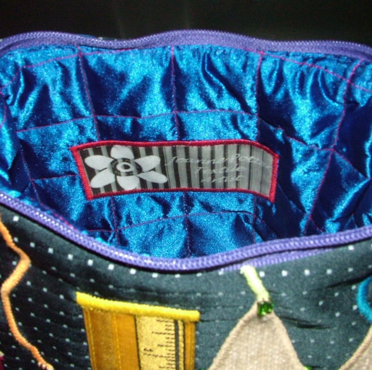 This bag has a purple chunky zip to fasten, inside is a quilted blue satin lining with contrast red stitching. The lining has been hand stitched into bag for a totally quality finish.