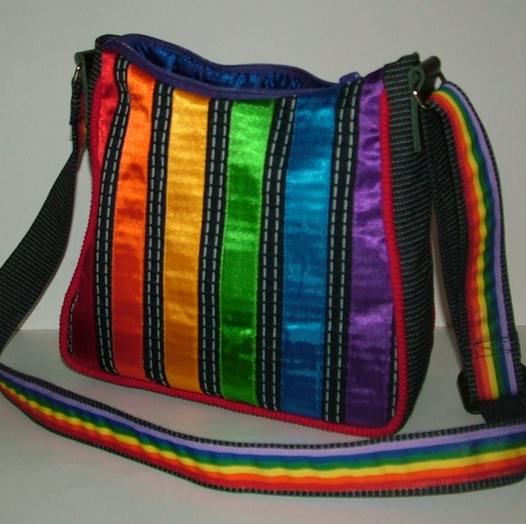 The bag is a Navy fabric with 8 rainbow stripes of satin ribbon which mirror pencil colours on front.