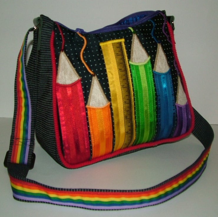 The front is made from a dashed Navy fabric that has been layered with 4 different coloured ribbons (3 different size ribbons on each pencil) to produce a multi coloured pencil effect,(there is also a yellow ruler) each pencil has been hand beaded to give the pencil leads an extra sparkle.