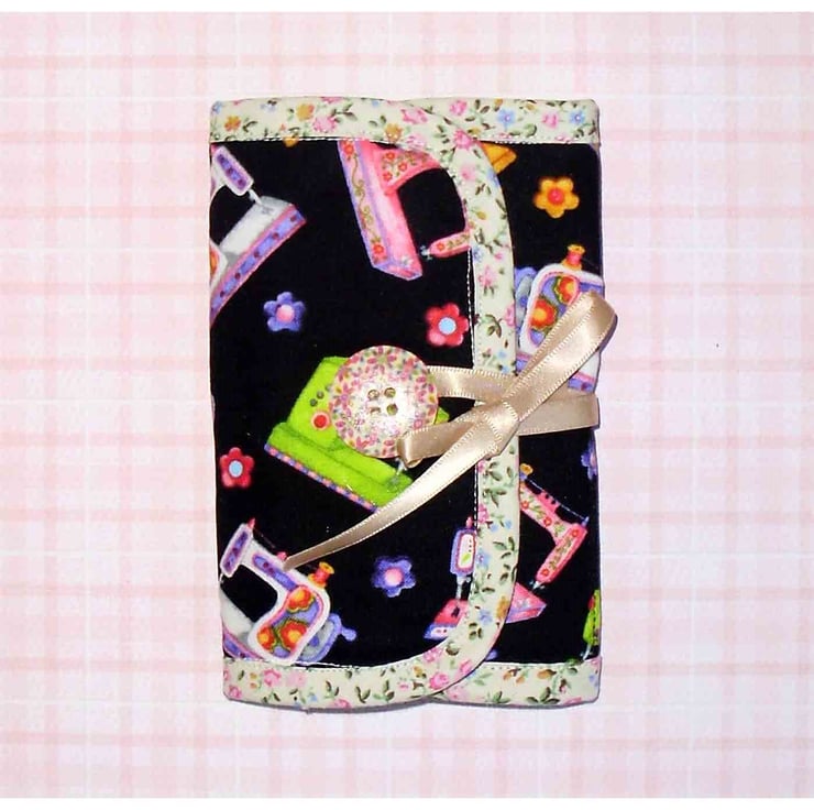 This fun sewing case combines a needle case with space to store you scissors, unpicker etc. It comes complete with a tape measure and mini sewing set as shown in photo, and has space for scissors etc. and flannel leaves for your pins and needles. It is made from a bright sewing machine themed fabric with a spot print lining (see photos) It fastens with a ribbon to tie around the pretty button. It measures approx. 9.5 x5.5 inches when opened (see second photo) and 3.5 x5.5 inches when closed. Great to take with you to workshops, or to keep in the cupboard for those little repair jobs.