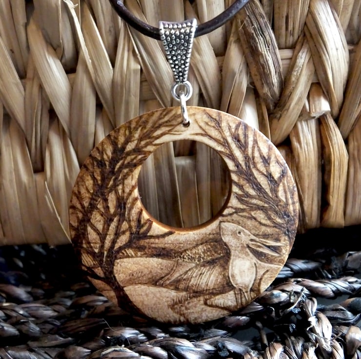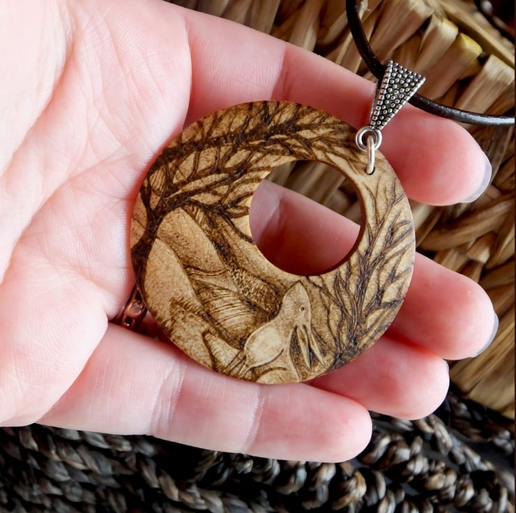 The design on this pendant is a moon gazing hare, surrounded by fields and trees following the lines of the pendant. I try to photograph the items in different lights.