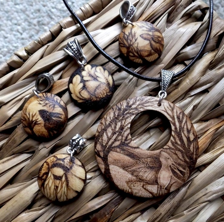 The image is my own, drawn freehand onto the wood. I use no templates or transfers, and each pendant is a little different. These pendants are quite challenging as the area to create a design is so small.