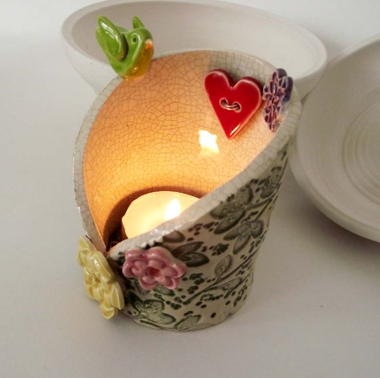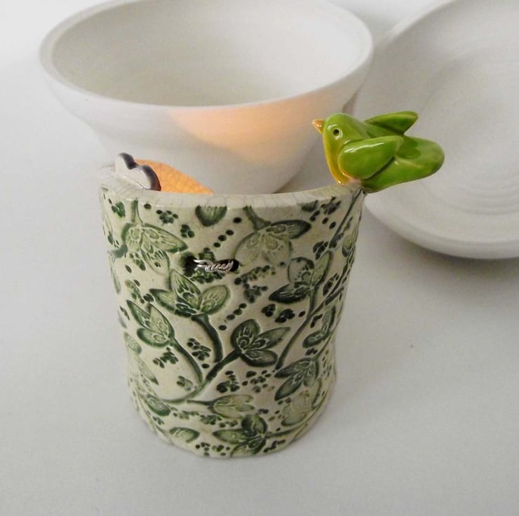 It is then glazed with a vintage style crackle glaze and fired again to a top temperature of 1100 degrees, so it is nice and strong.