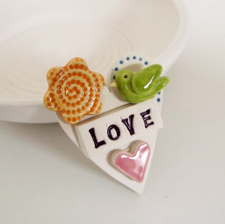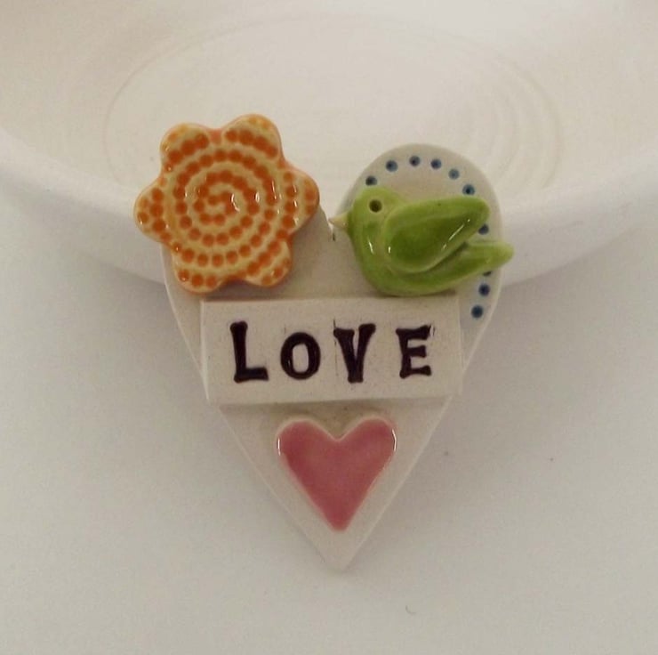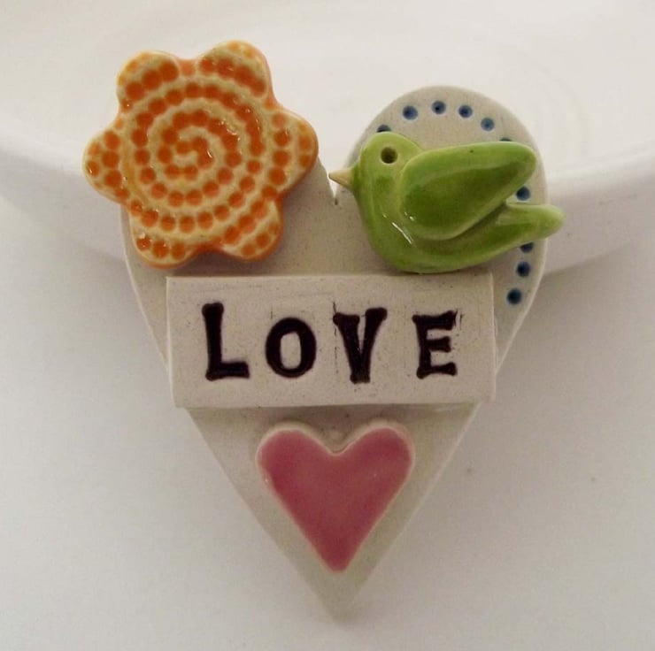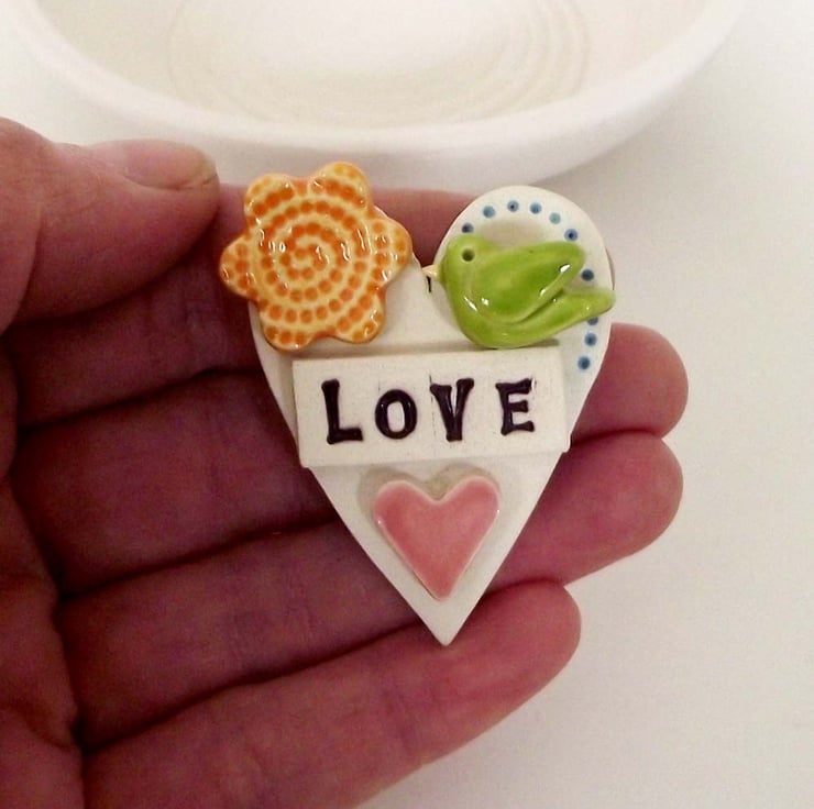 This cute little bird brooch is made from white earthenware clay and twice fired to a top temperature of 1100 degrees.