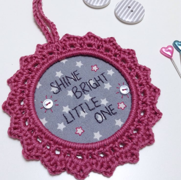 Entirely made by hand with crochet and hand embroidery, a cute little wall decoration with encouragement for your little one. Made using simple stitches and tiny pearly buttons this is an understated decoration for a little girls bedroom wall.