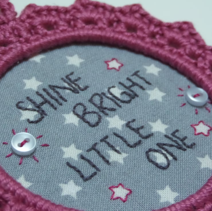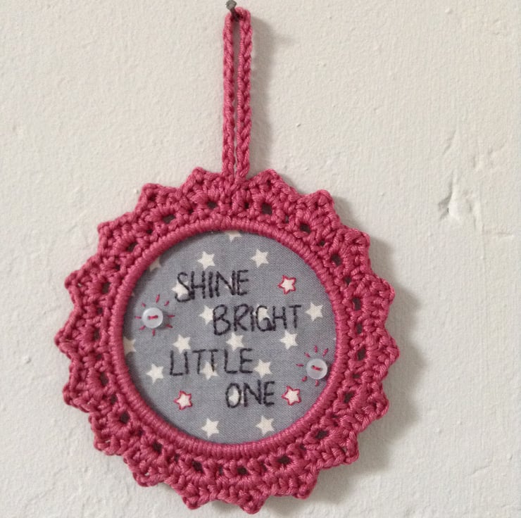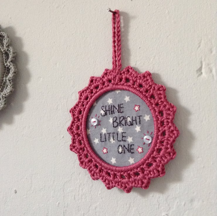I hand embroidered the lettering on lovely star printed cotton fabric, and used 100% mercerised cotton, which has a lovely lustre, to crochet the frame the embroidery sits in. The wall hanging measures approximately 5" across.