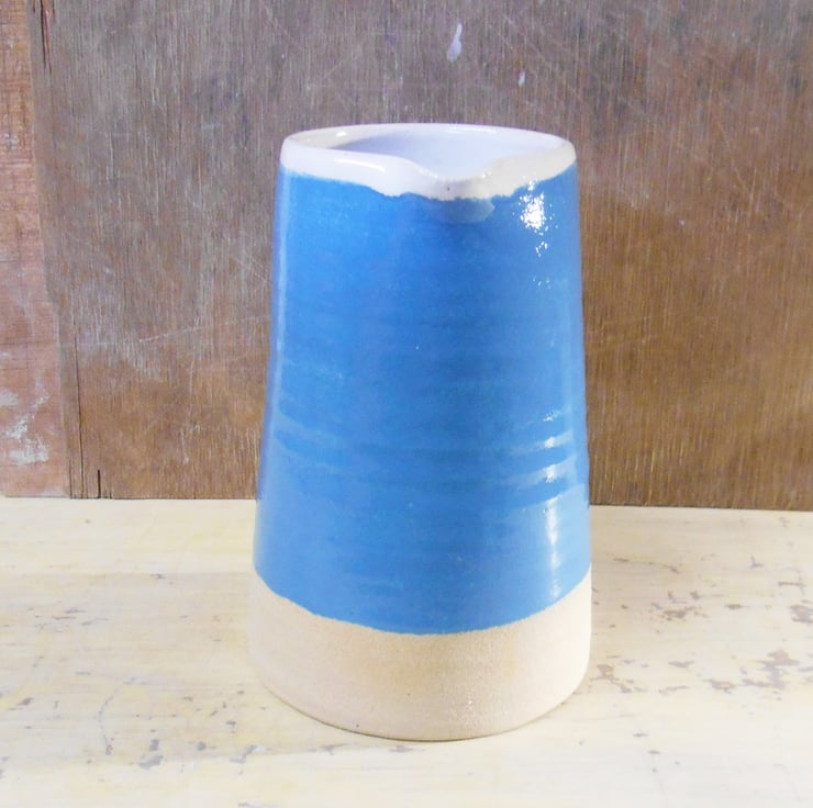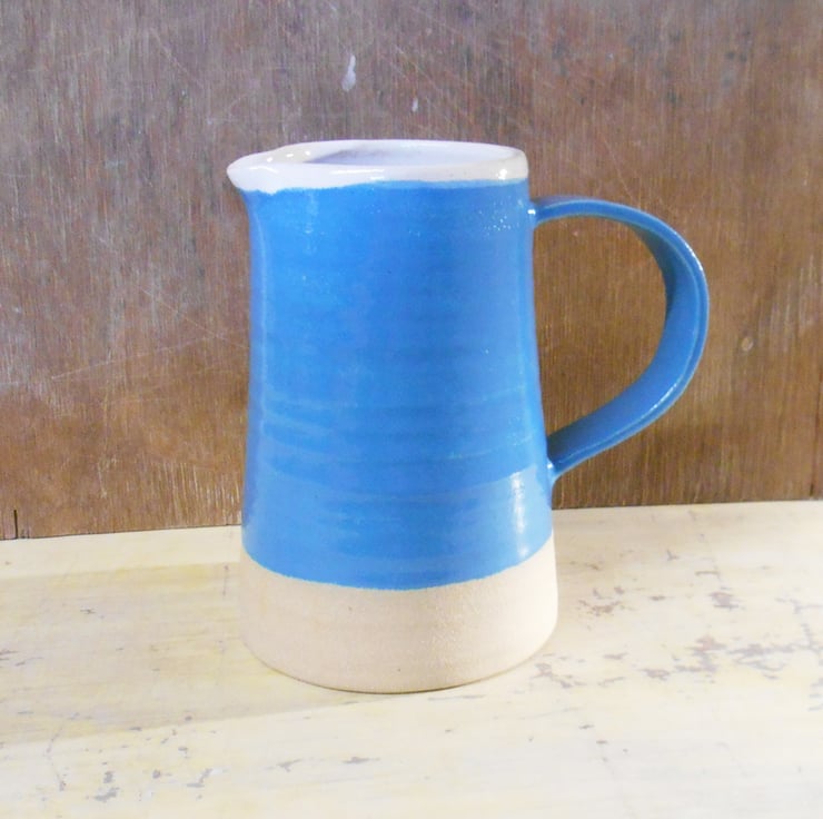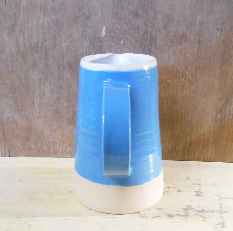 Wheel thrown durable stoneware Jug. The interior has been glazed with shiny Tin white glaze, and the exterior has shiny Neon Blue Glaze.