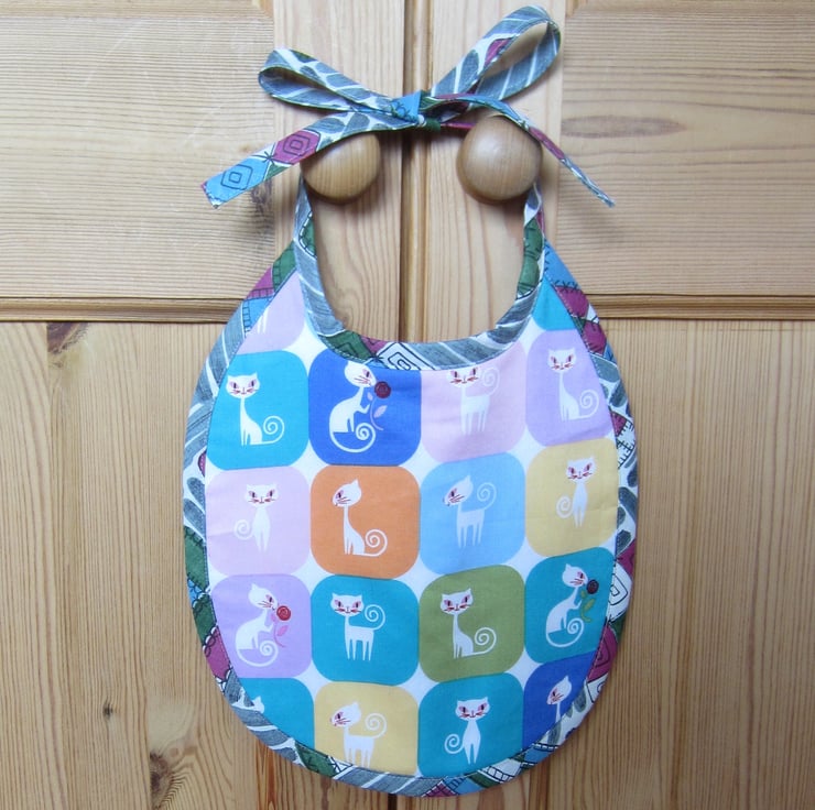 Small babies bib featuring Siamese cats in different poses. Edged with a vintage 1950s fabric (un-used) and backed with white towelling. Suitable for babies aged about 6 to 12 months. It measures 26.5 x 23.5 cm and fastens with a bow at the back of the neck for a good fit.