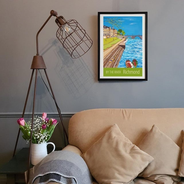 A contemporary travel poster style print of the riverside in vibrant Richmond, London, from my own original acrylic painting.