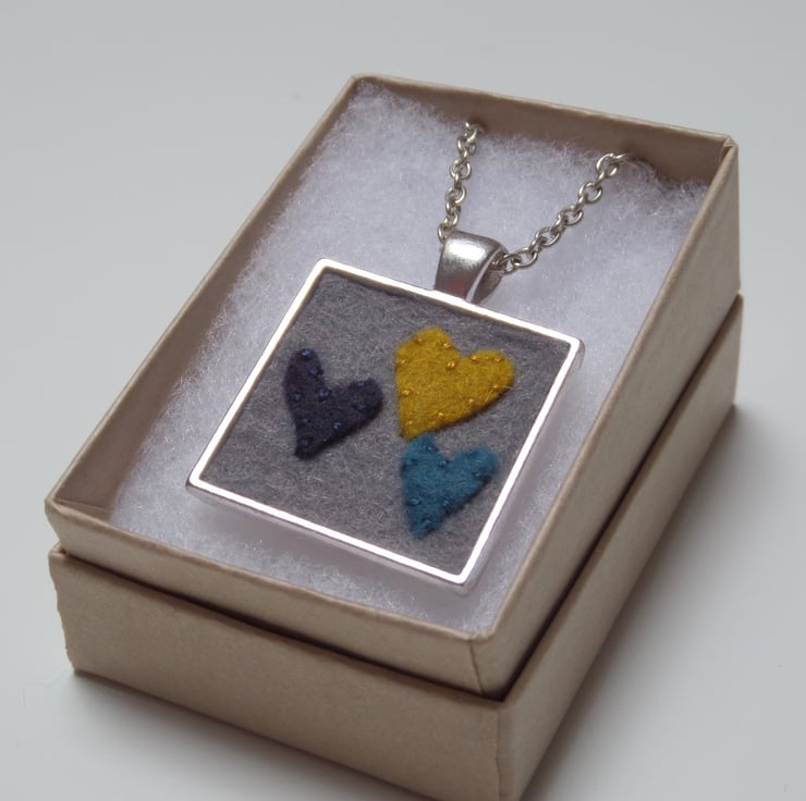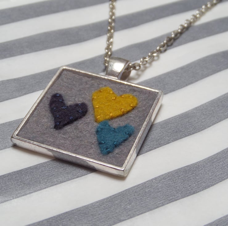This necklace features a grey wool felt back ground, with navy, turquoise and mustard hearts. The pendant is 2.6cm across. The pendant hangs from a 48cm (19") trace chain in 925 silver.