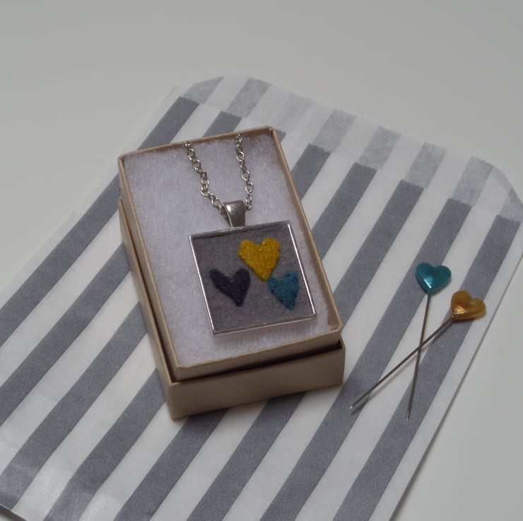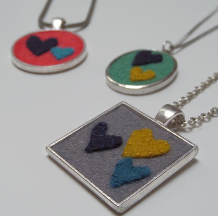 Part of my 'With Love' jewellery collection, featuring tiny hand cut wool felt hearts hand stitched and mounted in silver effect pendants.