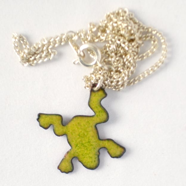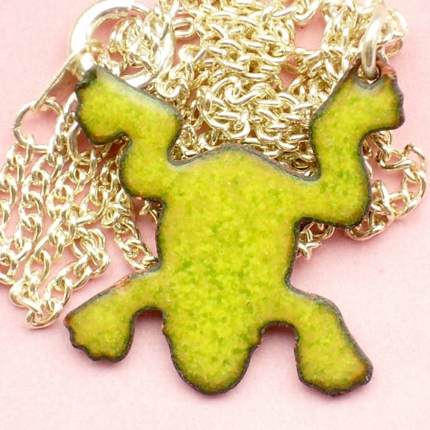 The frog measures 18mm by 21mm. It is mounted on a 45cm silver plate chain that fastens with a simple bolt ring.
