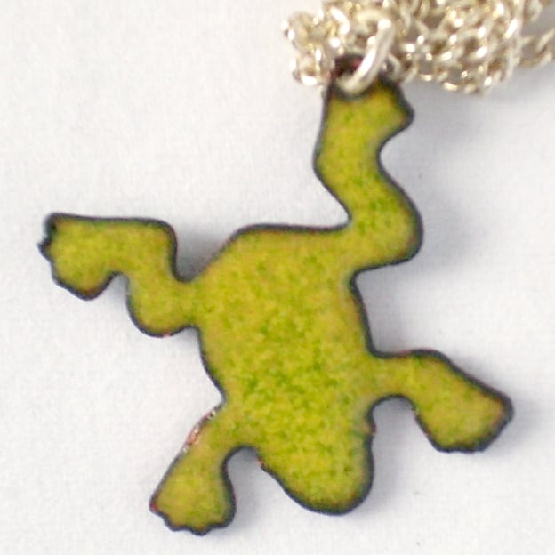 I have made this pendant by making a base coat of clear enamel over that I have pur a layer of a yellow enamel then a layer of green enamel. The coloured layes are thin enough to allow the copper to shine through, adding a golden brown hue.