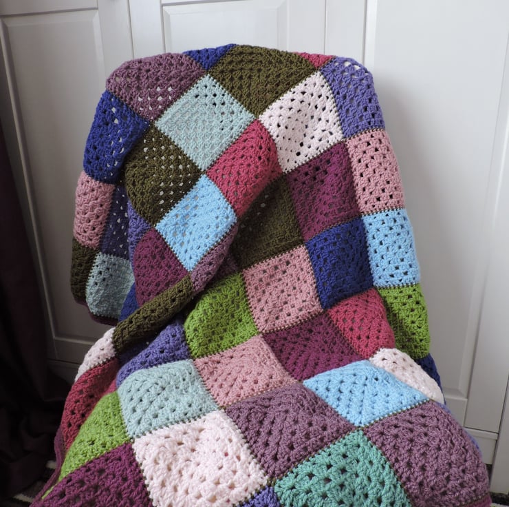 I've crocheted this lap blanket in assorted single colour patchwork granny squares. Acrylic double knit yarns in a miriad of cottage garden colours finishing with a aubergine edging.