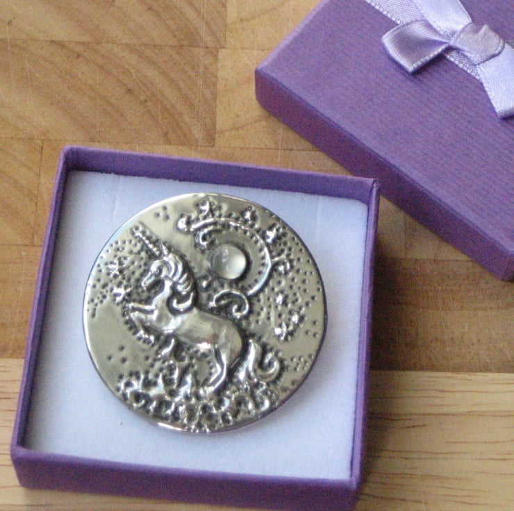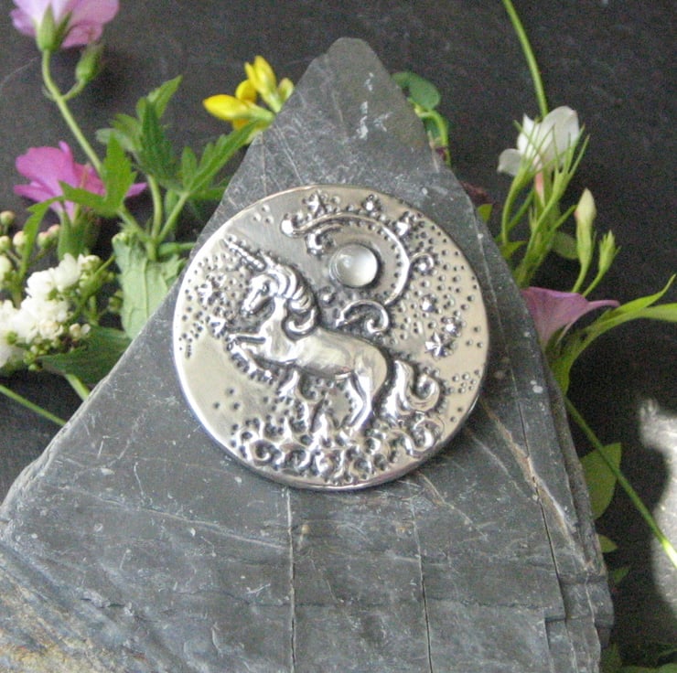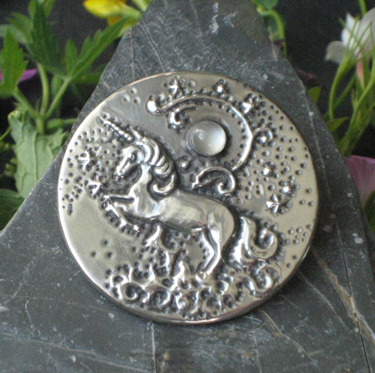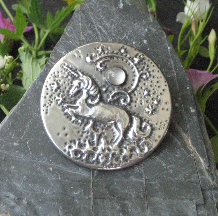 Silver unicorn brooch in pewter with moonstone,handmade. I have crafted this dramatic piece of handmade jewellery from pewter and set into it a genuine moonstone cabochon. The brooch measures 45mm across and despite its size is light in weight. It has a 30mm pin with safety catch on the reverse. It will be sent to you in a pretty gift box.