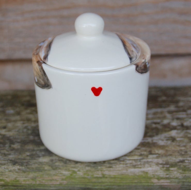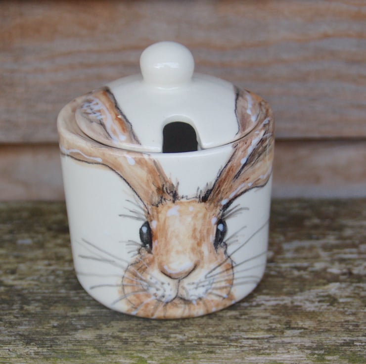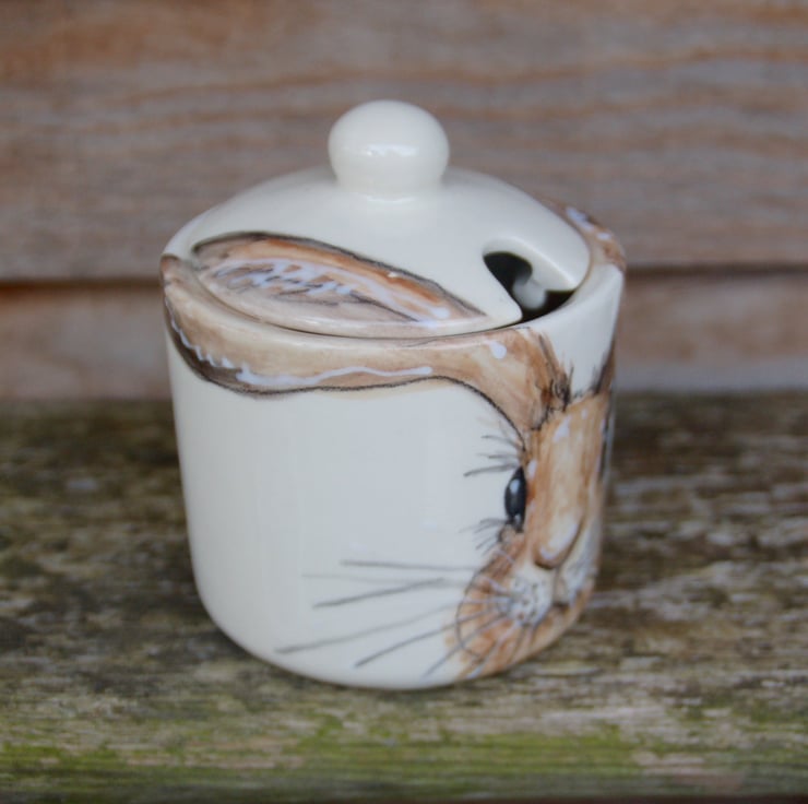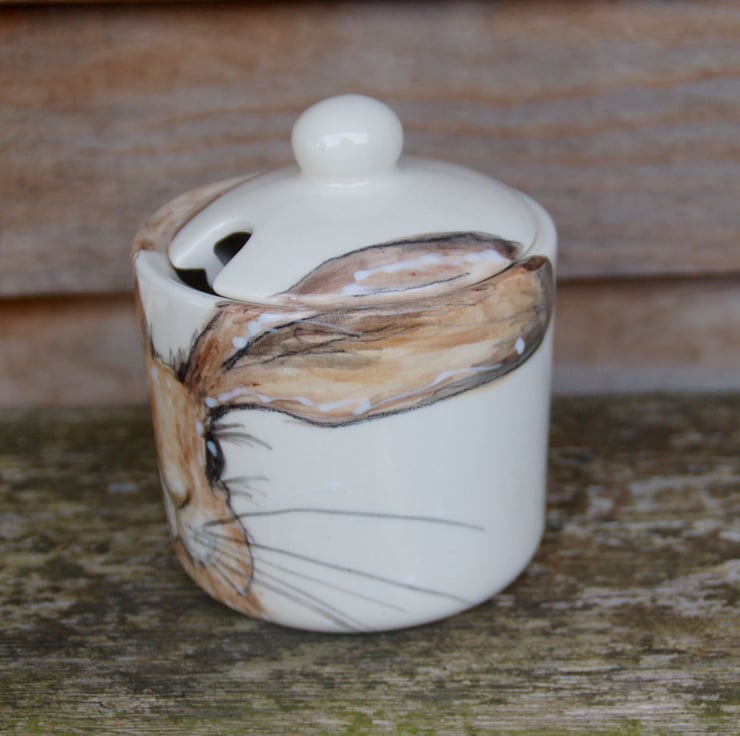 This is a free hand painted lidded sugar bowl. The hares ears go up and over the lid of the pot and the design is replicated underneath so it still looks like an ear when the lids is off! This pot is 10cm high including the lid.