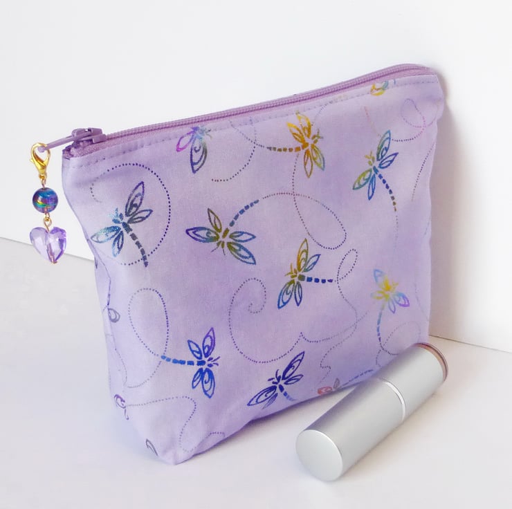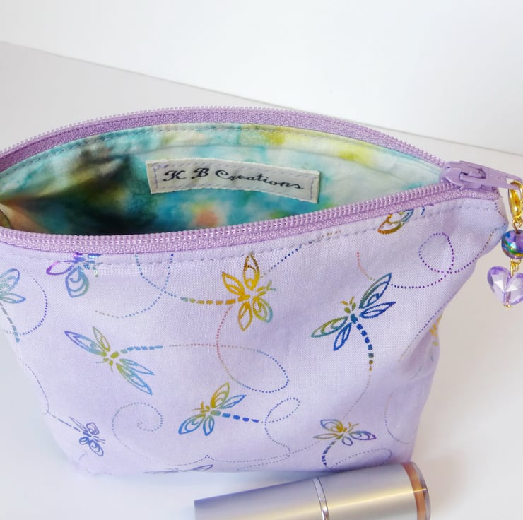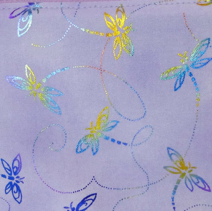 This is my small sized make up/cosmetic bag, made of a lovely 100% cotton fabric with a dragonfly design on it in a pretty lilac with foil effect, multi colour. dragonflies.