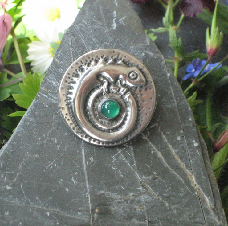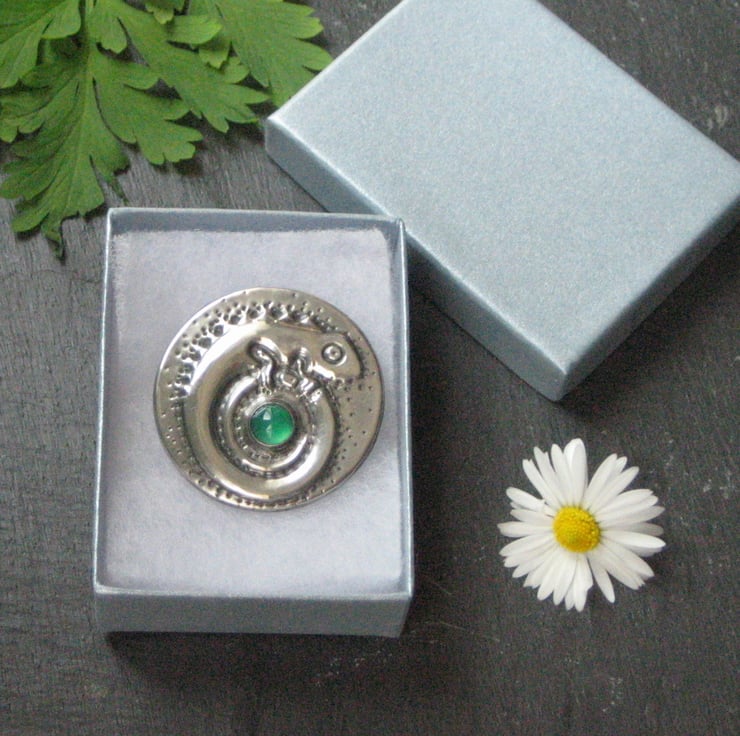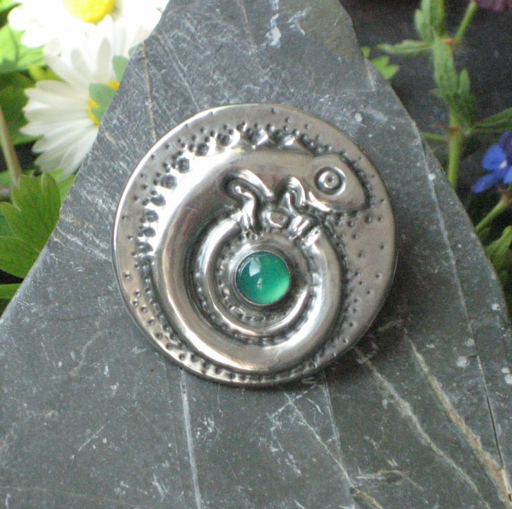 Silver chameleon pewter jewellery brooch with green agate. This little shiny metal brooch has been hand crafted in pewter and set with a pretty green agate stone. It measures 32mm across and has a 25mm pin with safety catch. Made by me to my own design and exclusive to The Owl and the Pussycat Gift Shop.