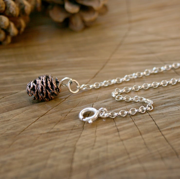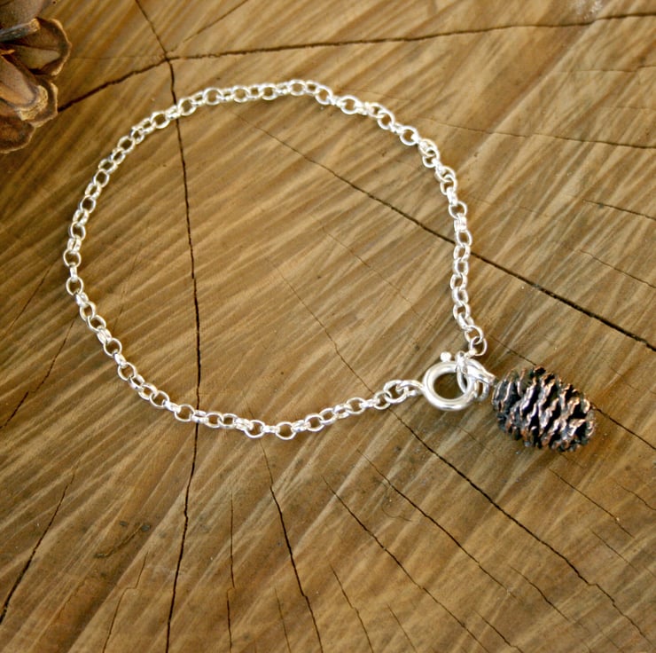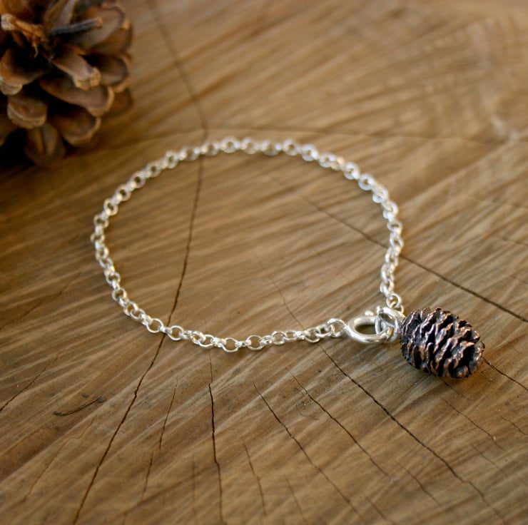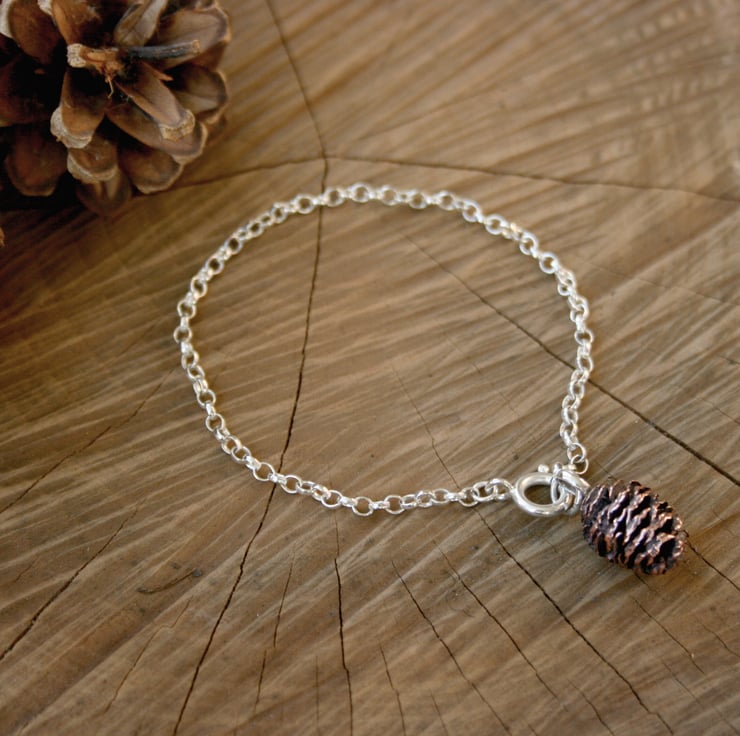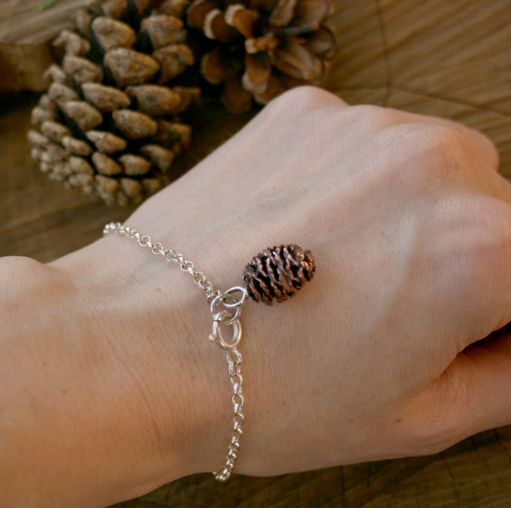 This woodland bracelet is the perfect gift for a nature lover or magpie for unique jewellery. The pinecone is hand cast in pink bronze and fixed to a sterling silver chain bracelet.