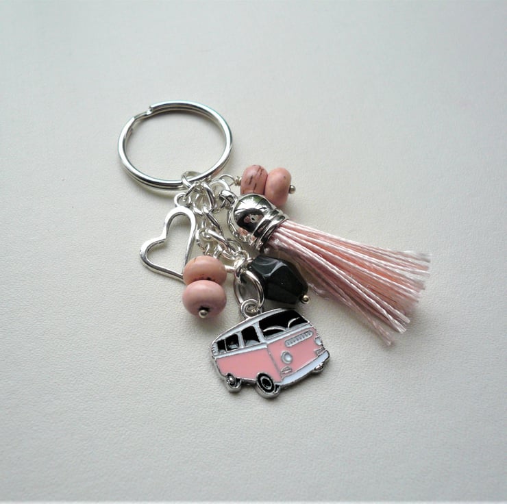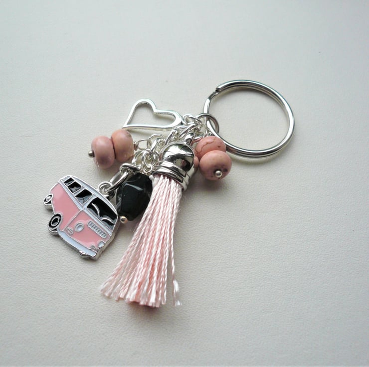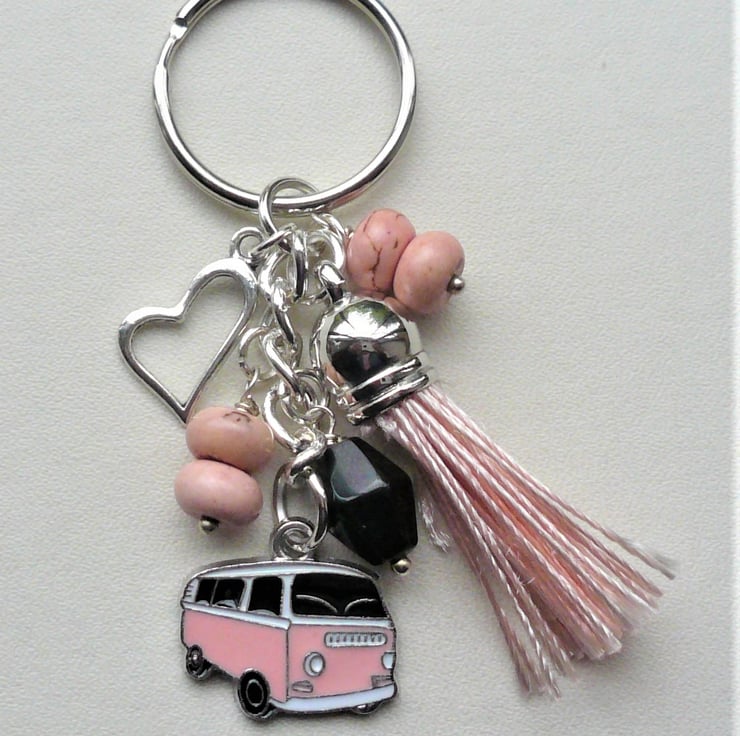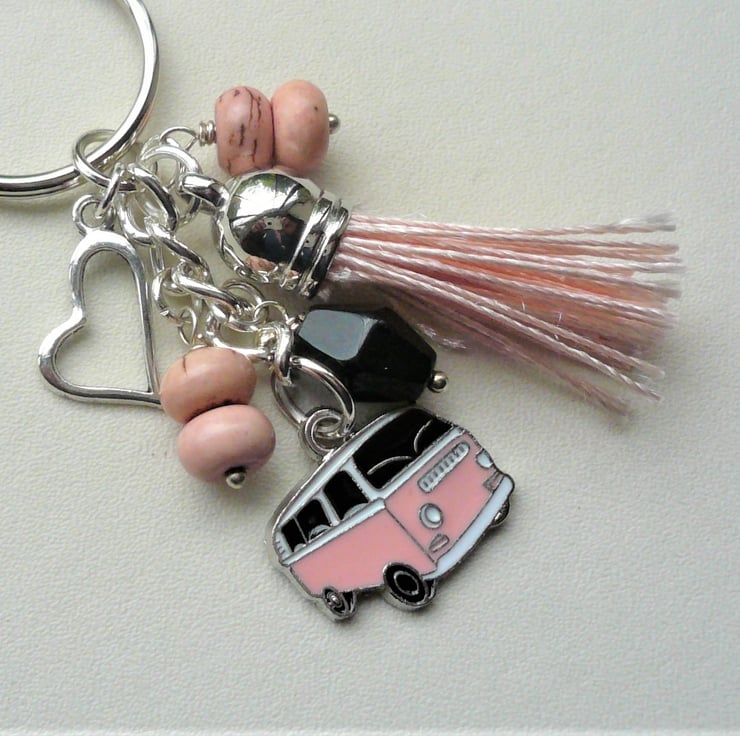 This fun keyring is made up of a 20mm wide pale pink and black painted enamel Tibetan silver camper van charm teamed with co-ordinating 8mm Howlite rondelle beads and 10mm long black faceted glass bead, co-ordinating tassel and 15mm Tibetan silver outline heart charm. All attached to a 25mm silver plated keyring and chain.