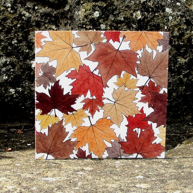 ‘Autumn Leaves’ - This card is a reproduction of one of my original watercolour designs. Inspired by the colours and shapes of fallen plane leaves, I designed a stylised pattern which shows off the rhythms of the curves and points.