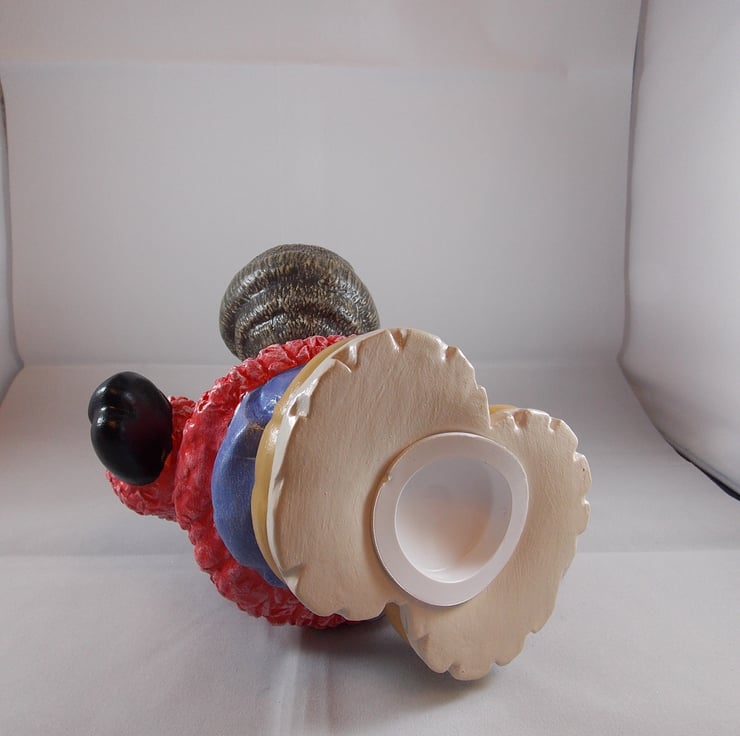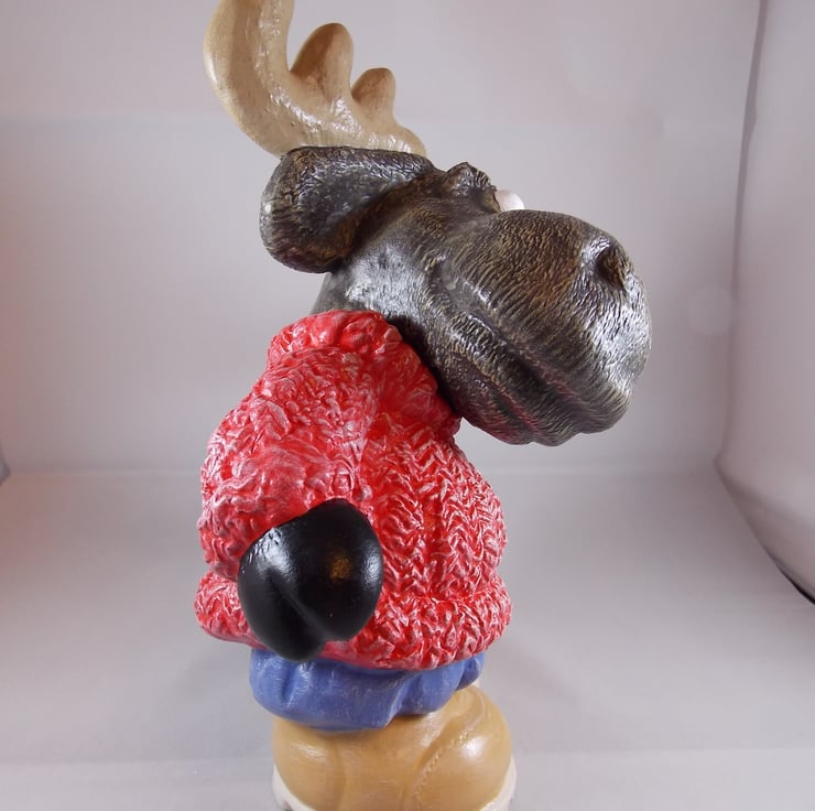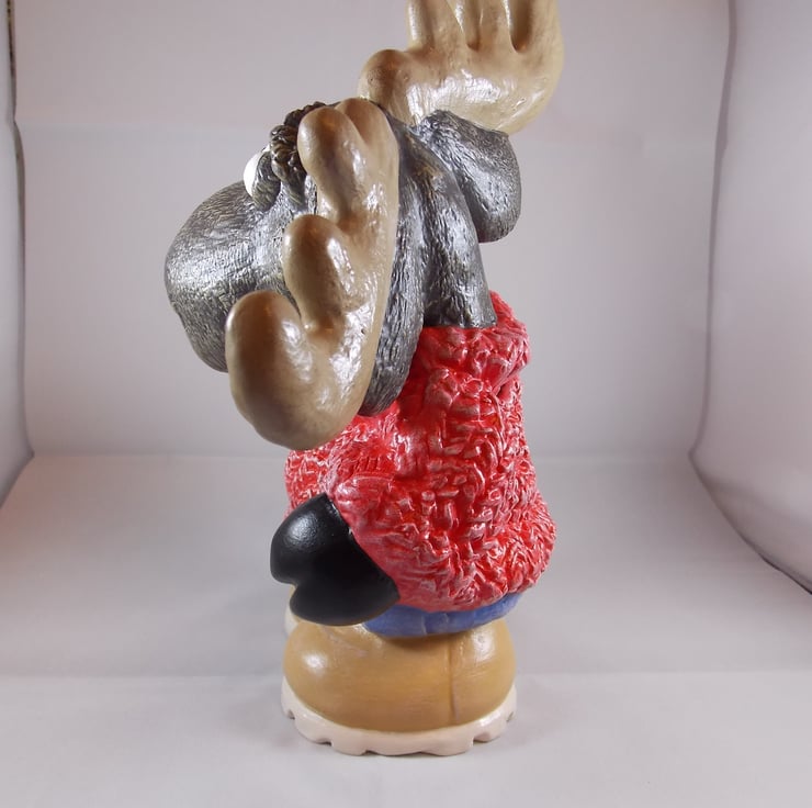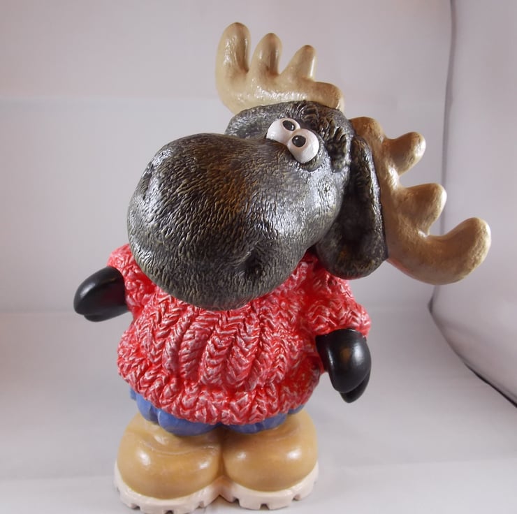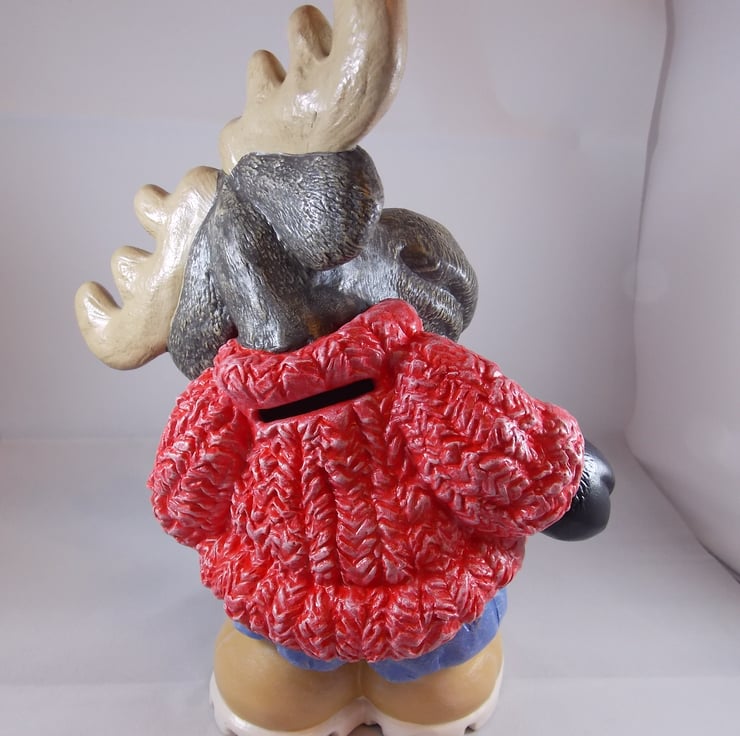 I have for sale a large ceramic money box, which was hand painted by myself. It is a standing animal figurine, of a brown moose or reindeer, wearing a red jumper, blue trousers and light coloured shoes. It comes complete with a rubber bung in the bottom of the ornament. This would make a fun and novel addition to any child's bedroom or nursery, or perhaps given as a gift.