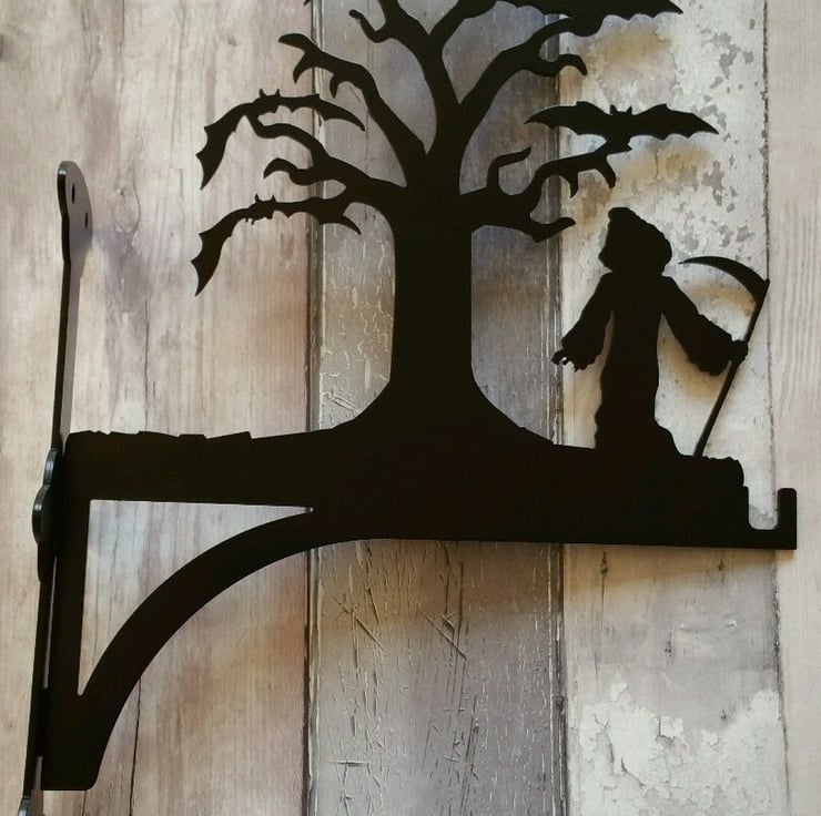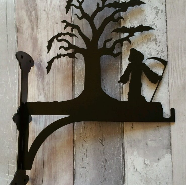 Part of our stunning new range of hanging basket brackets, this features the grim reaper stood by a tree full of bats.