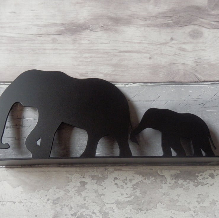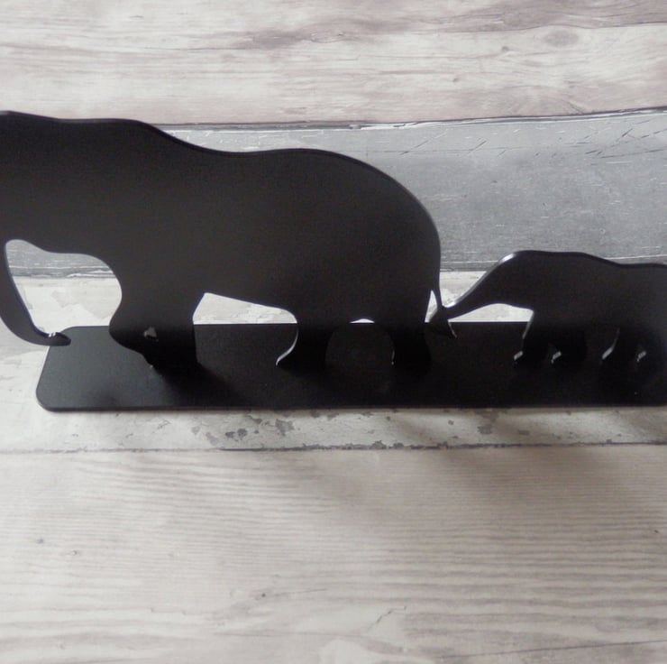 Part of our new line of freestanding ornaments, this features a silhouette of a baby elephant holding its mother's tail. It is hand-finished, laser cut, solid steel, with a black powdercoating for longevity. This is an industrial-grade finish, suitable for use indoors and outdoors.